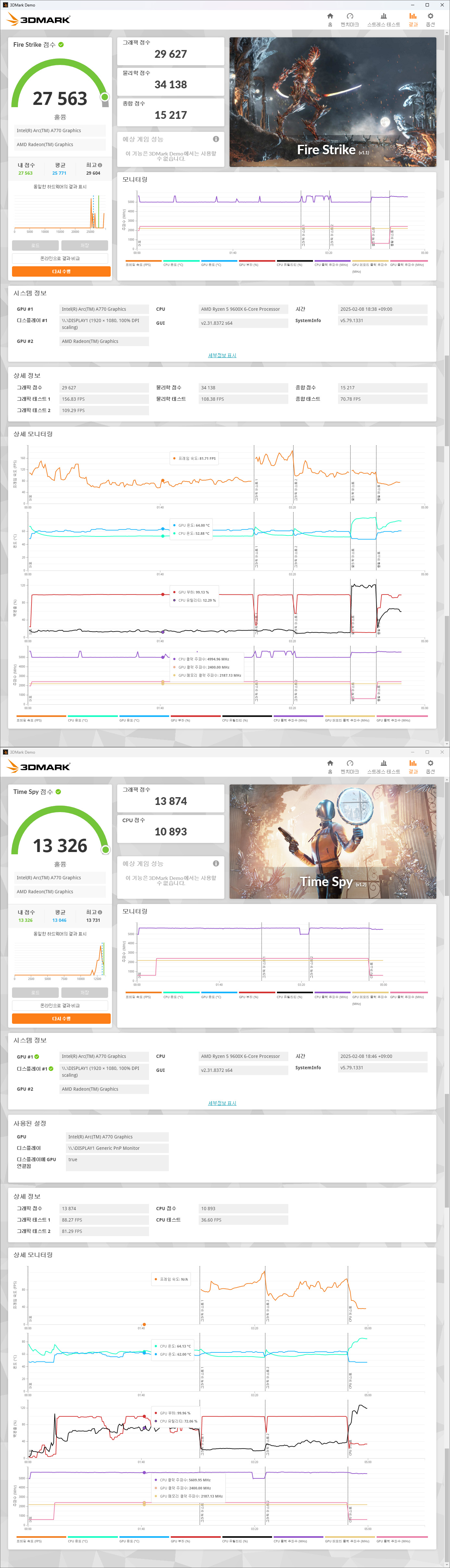 3DMARK 파이어 스트라이크와 타임 스파이 실행결과입니다.