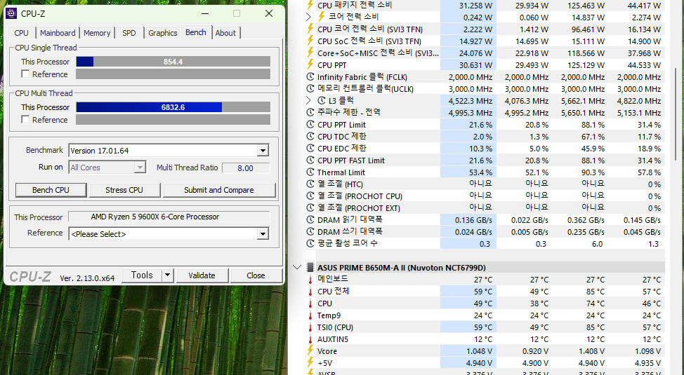 벤치테스트 실행시, 싱글 854.4 멀티 6832.6점이 측정되었습니다.