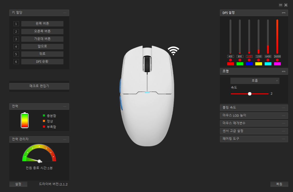 DPI 단계별로 LED 컬러가 변경되며, 전용 소프트웨어를 통해서 정적, 호흡, LED없음 옵션을 선택할 수 있습니다.