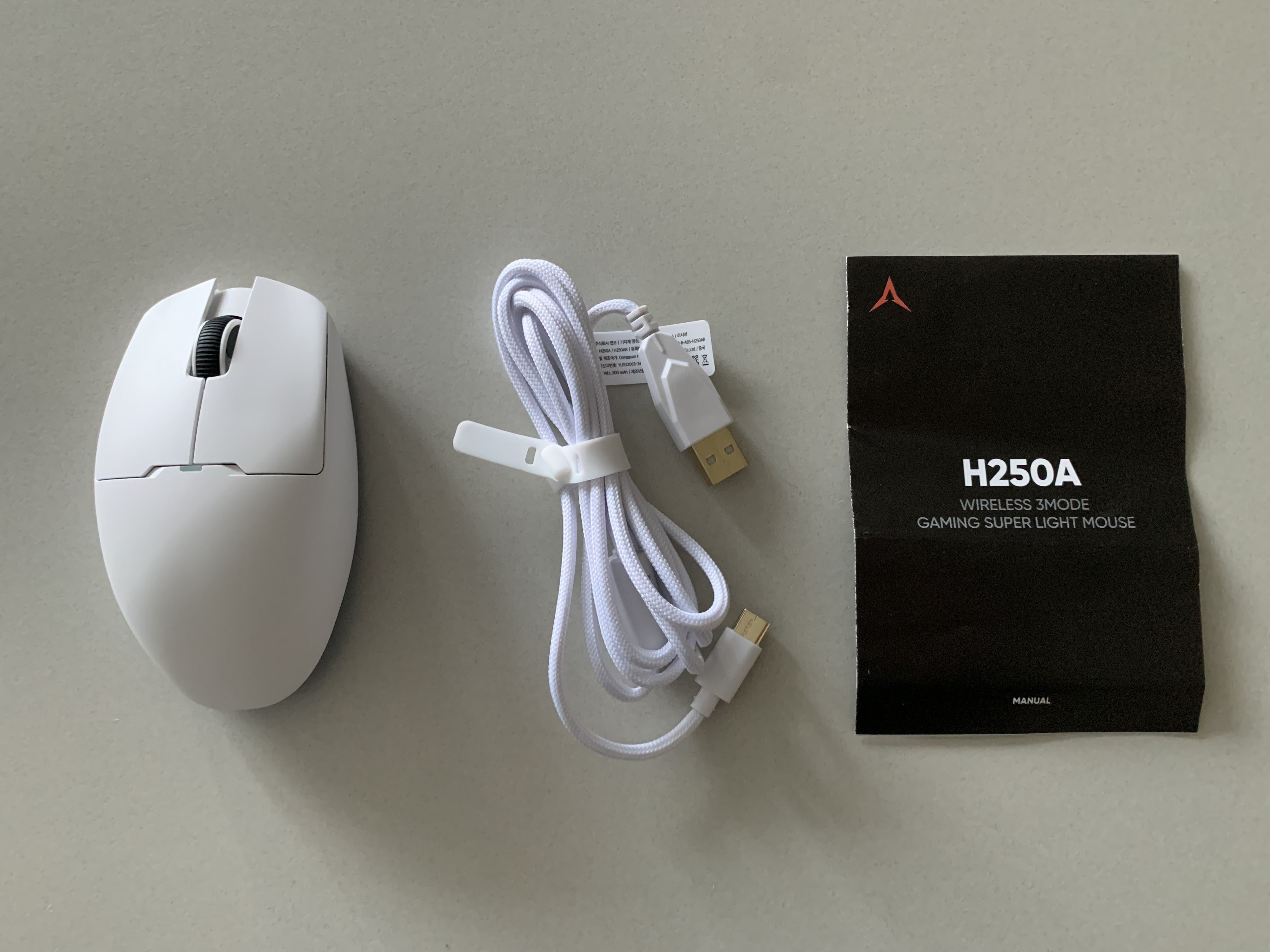 앱코(ABKO) H250A 마우스, USB C to A 케이블, 매뉴얼로 구성되어 있습니다.
