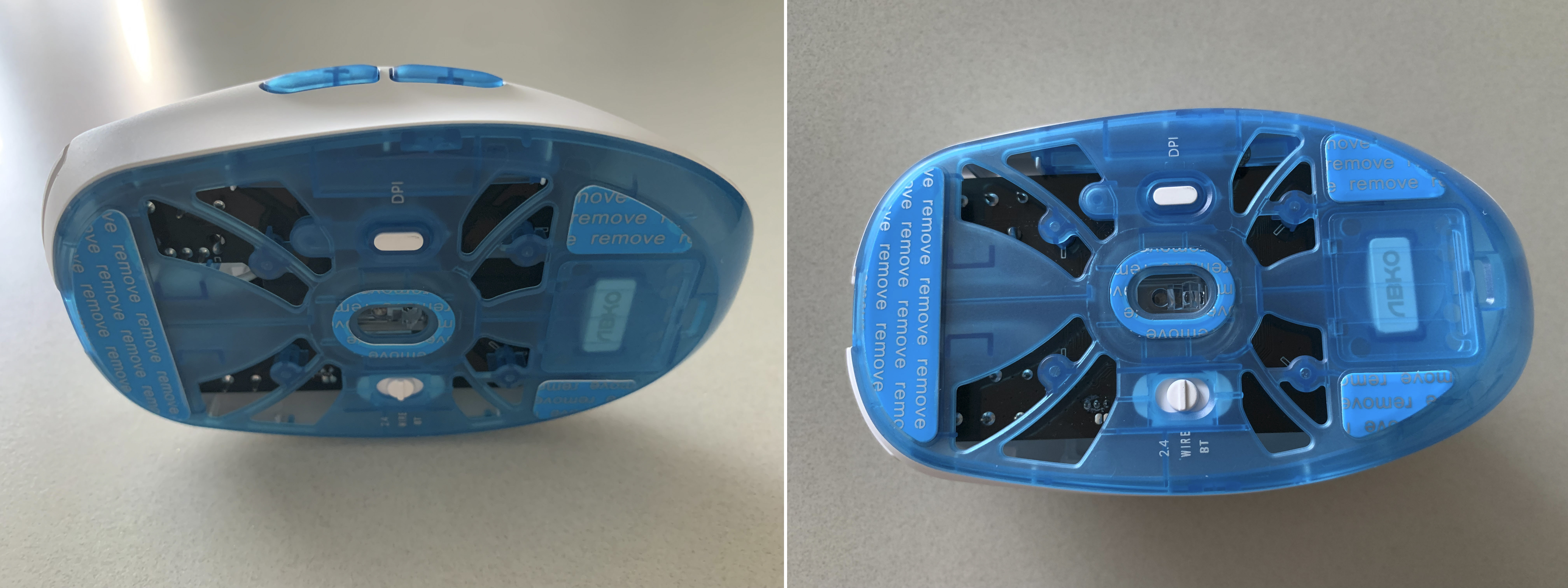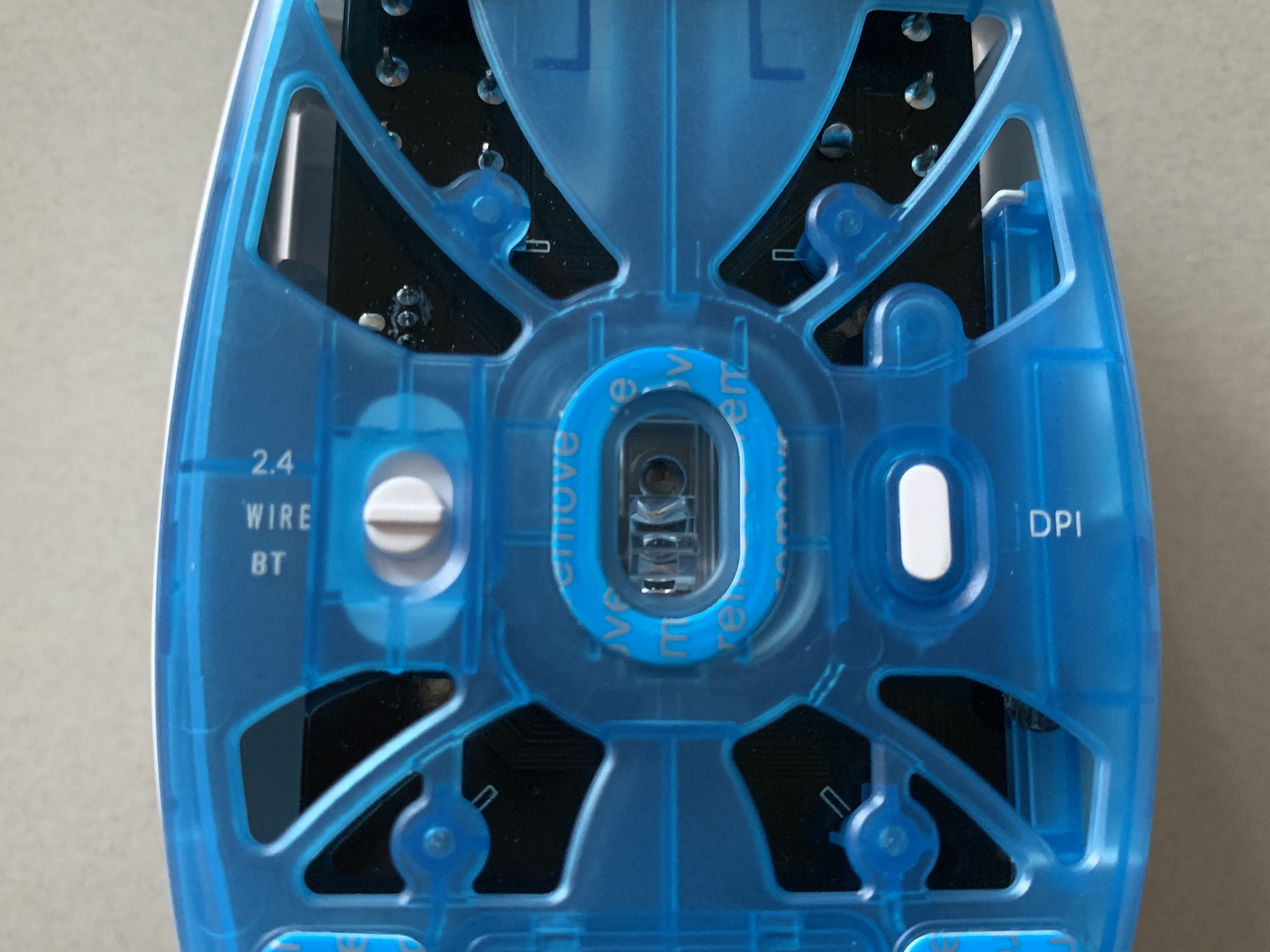 유선, 블루투스, 리시버등 3모드 연결을 지원하며, 마우스 바닥 부분에 DPI변경 버튼과 무선 리시버 수납공간이 있습니다.