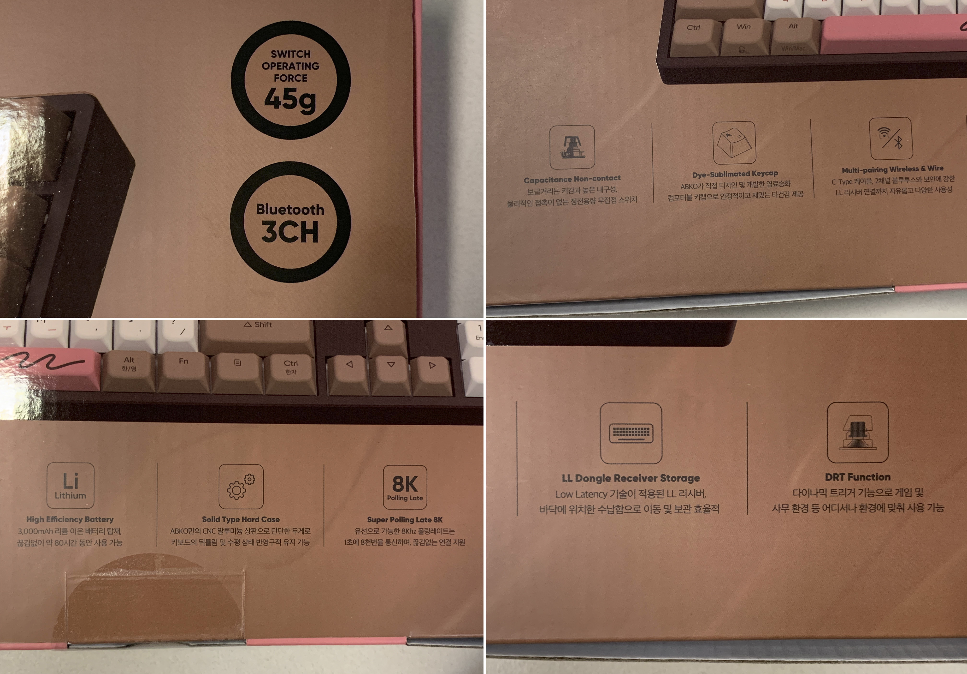 박스에는 AKN10BT의 제품명, 보글보글 무접점 스위치 45g, 앱코만의 CNC 알루미늄 상판, 앱코가 직접 디자인 및 개발한 염료승화 컴포터블 키캡, 유선/2채널 블루투스/LL리시버 등 3가지 연결모드지원, 3000mAh배터리가 탑재, 8K 폴링레이트 등 제품 특징을 확인할 수 있습니다.
