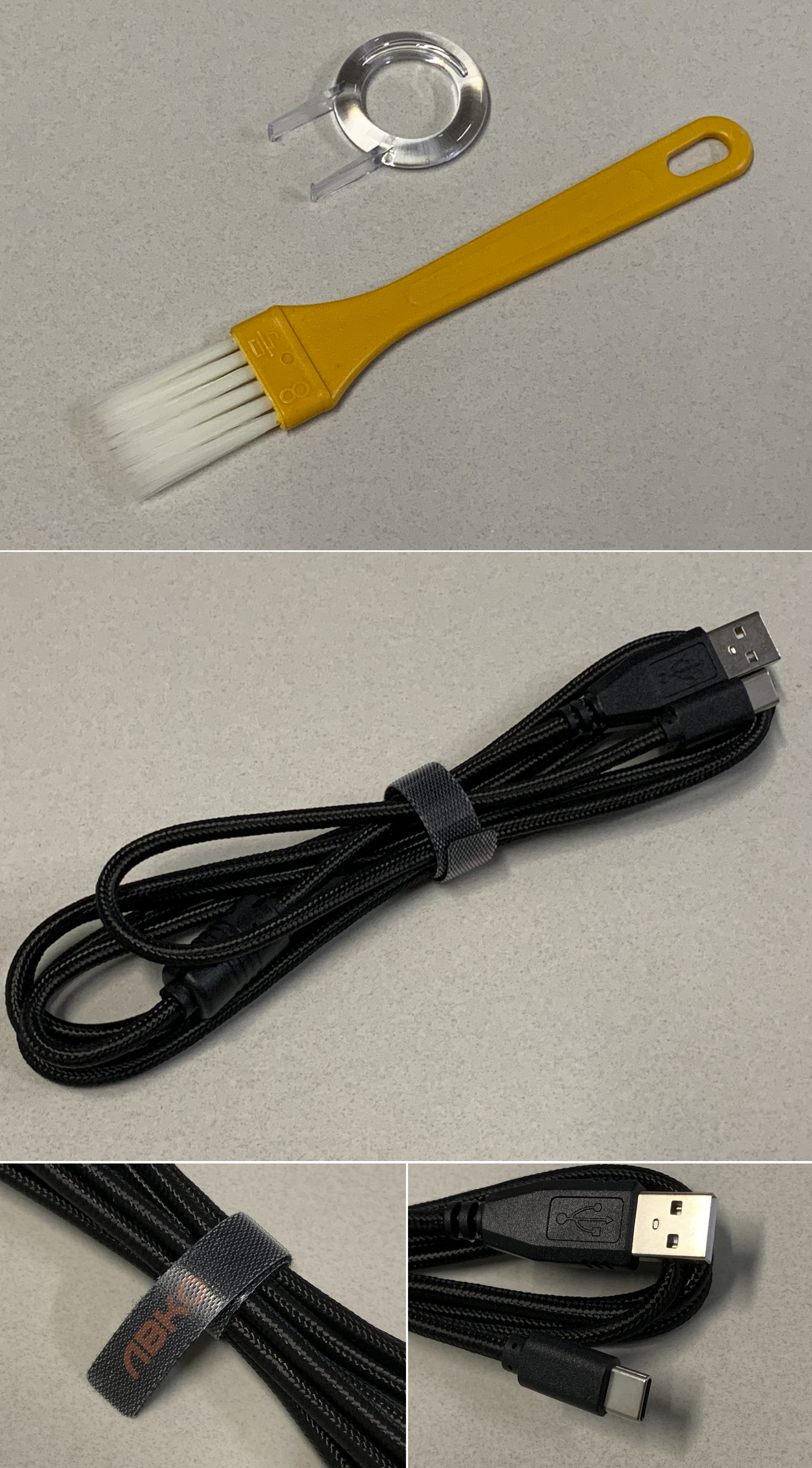 구성품은 키보드, 커버, 사용자 매뉴얼, C타입 케이블, 키캡 리무버, 브러시로 구성되어 있습니다.