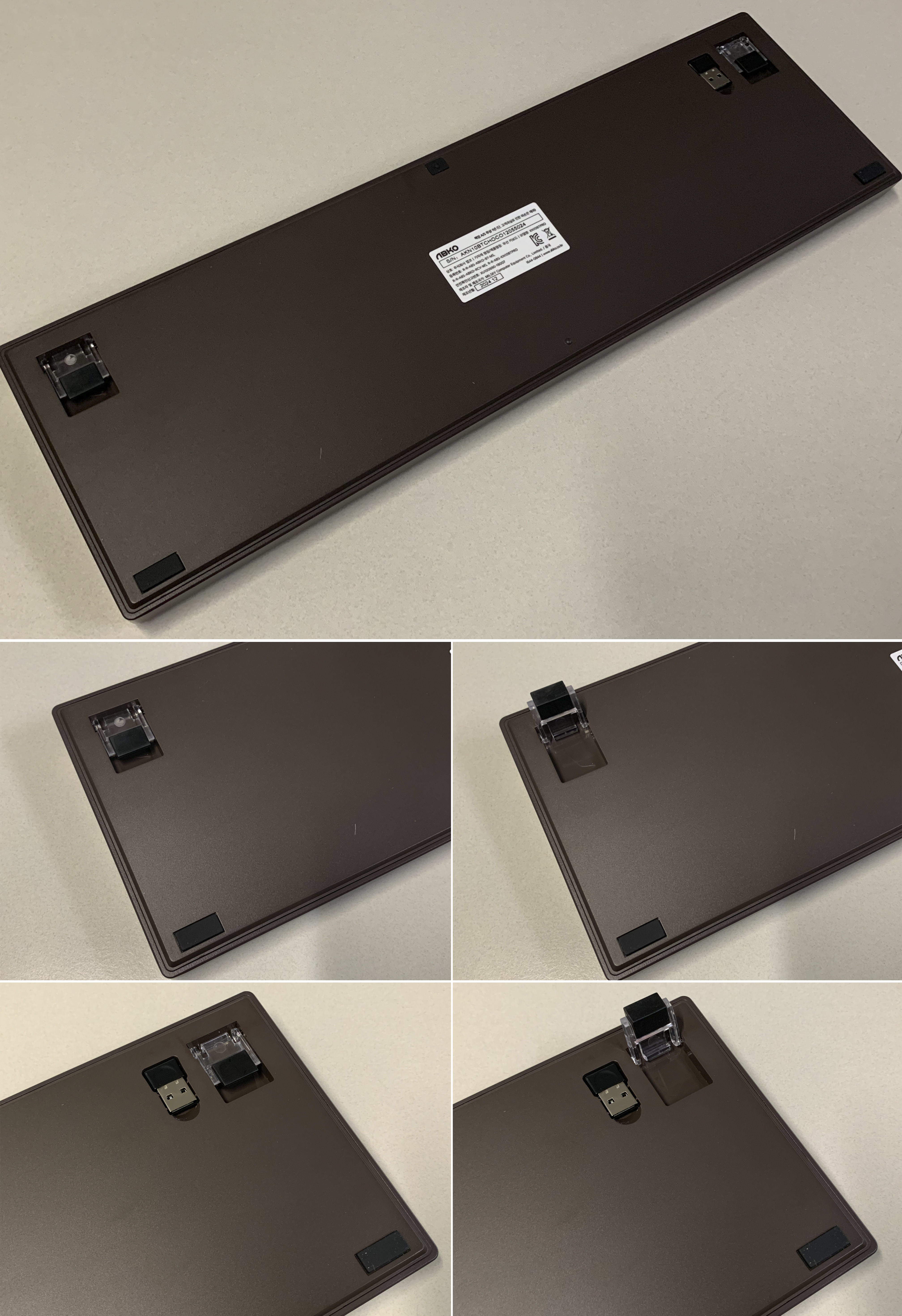 키보드 하단에는 미끄럼 방지 방지 패드로 키보드가 움직이지 않게 잘 고정시켜 주고 있으며, 높이 조절 다리와 LL리시버가 보관되어 있습니다. 높이 조절 다리로 사용자의 취향에 따라 높이 조절이 가능합니다.