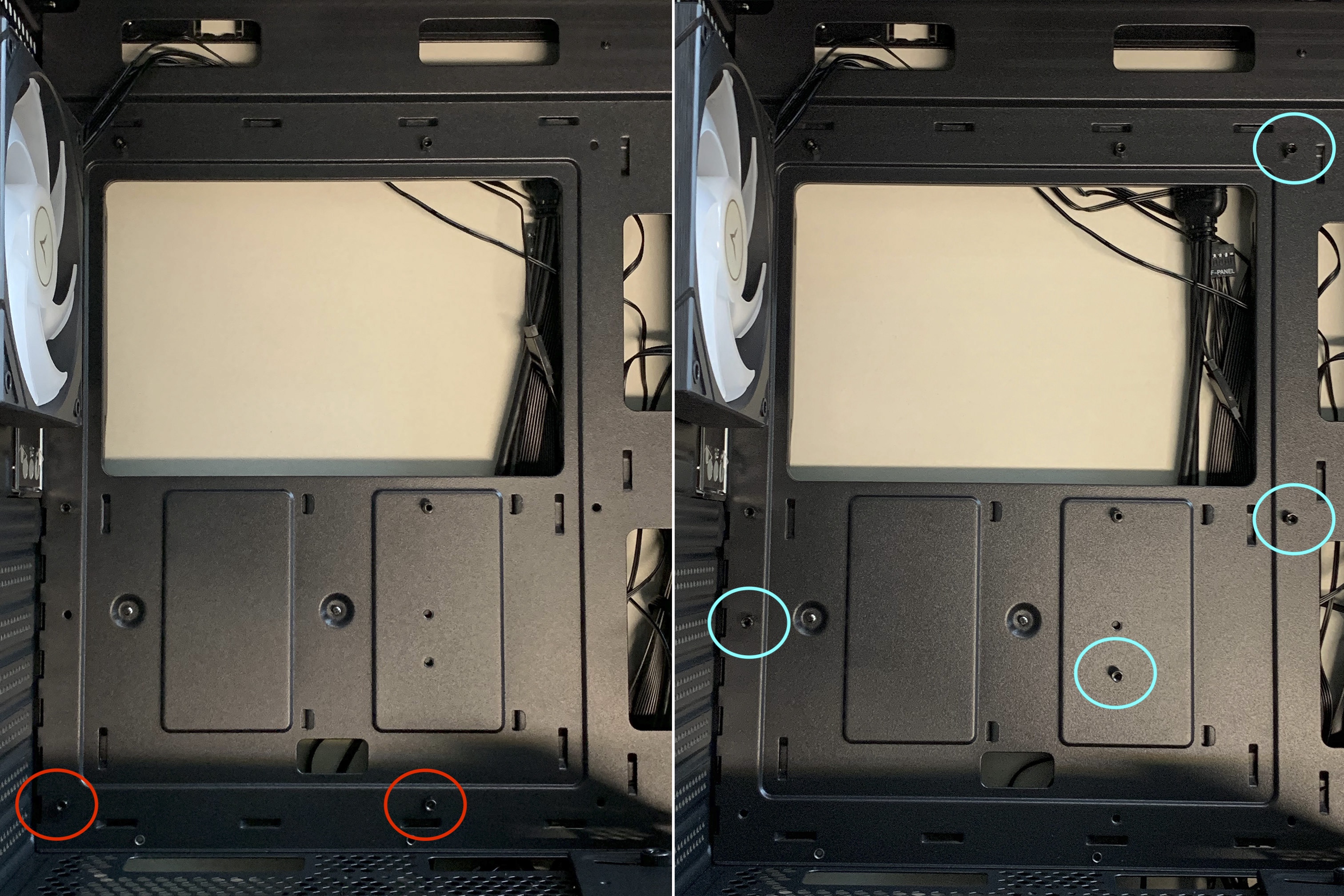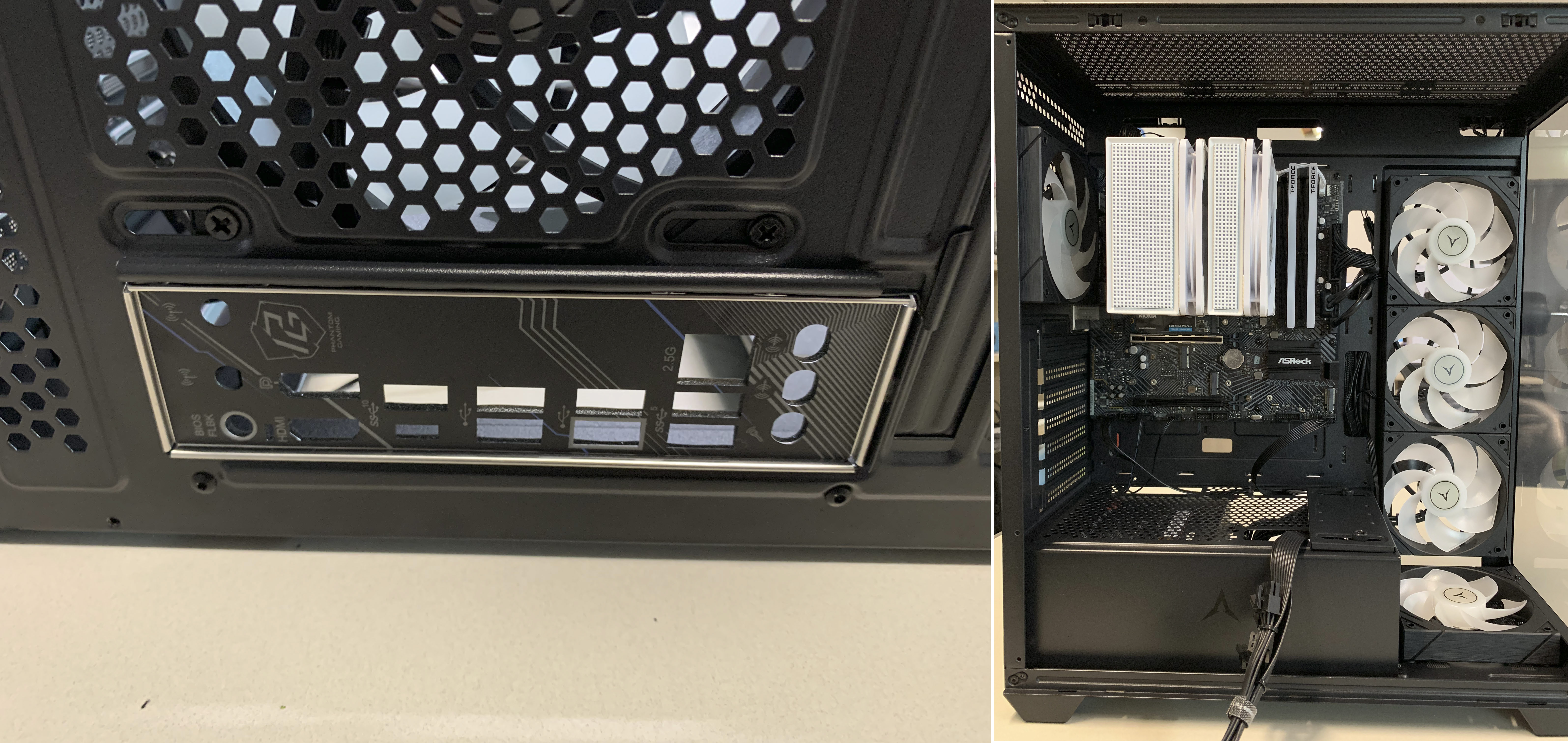 - 파워서플라이가 있는 곳에 별도의 공간을 마련해두어서, 파워서플라이가 풀모듈러 제품이 아니더라도 연결하지 않고 남은 케이블, 쿨링팬의 연결하고 남은 길이 케이블, 메인보드에 연결하는 케이블 등 모든 케이블을 한곳에 모아서 깔끔하게 보관할 수 있어서 조립이 편하다고 느꼈습니다.
