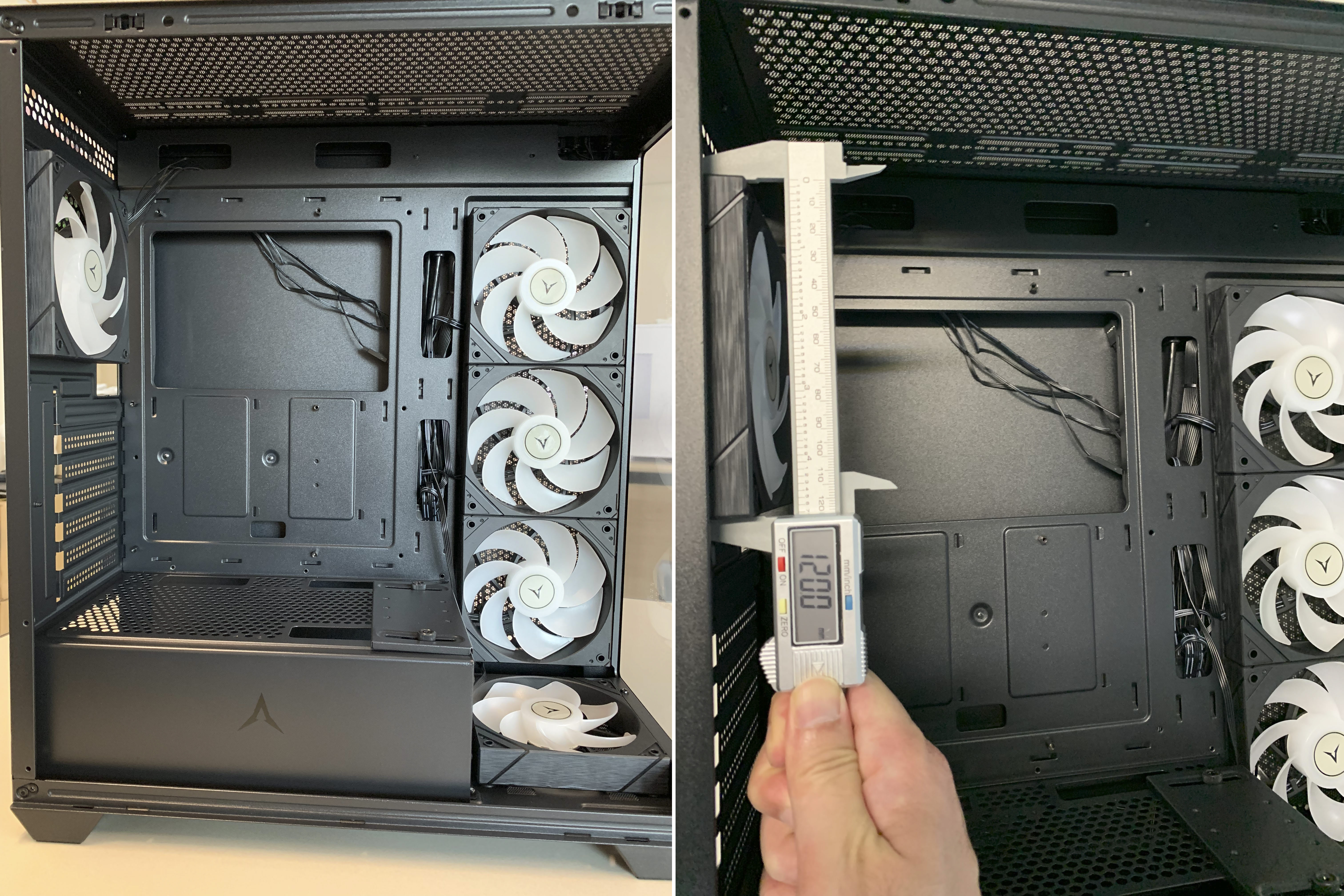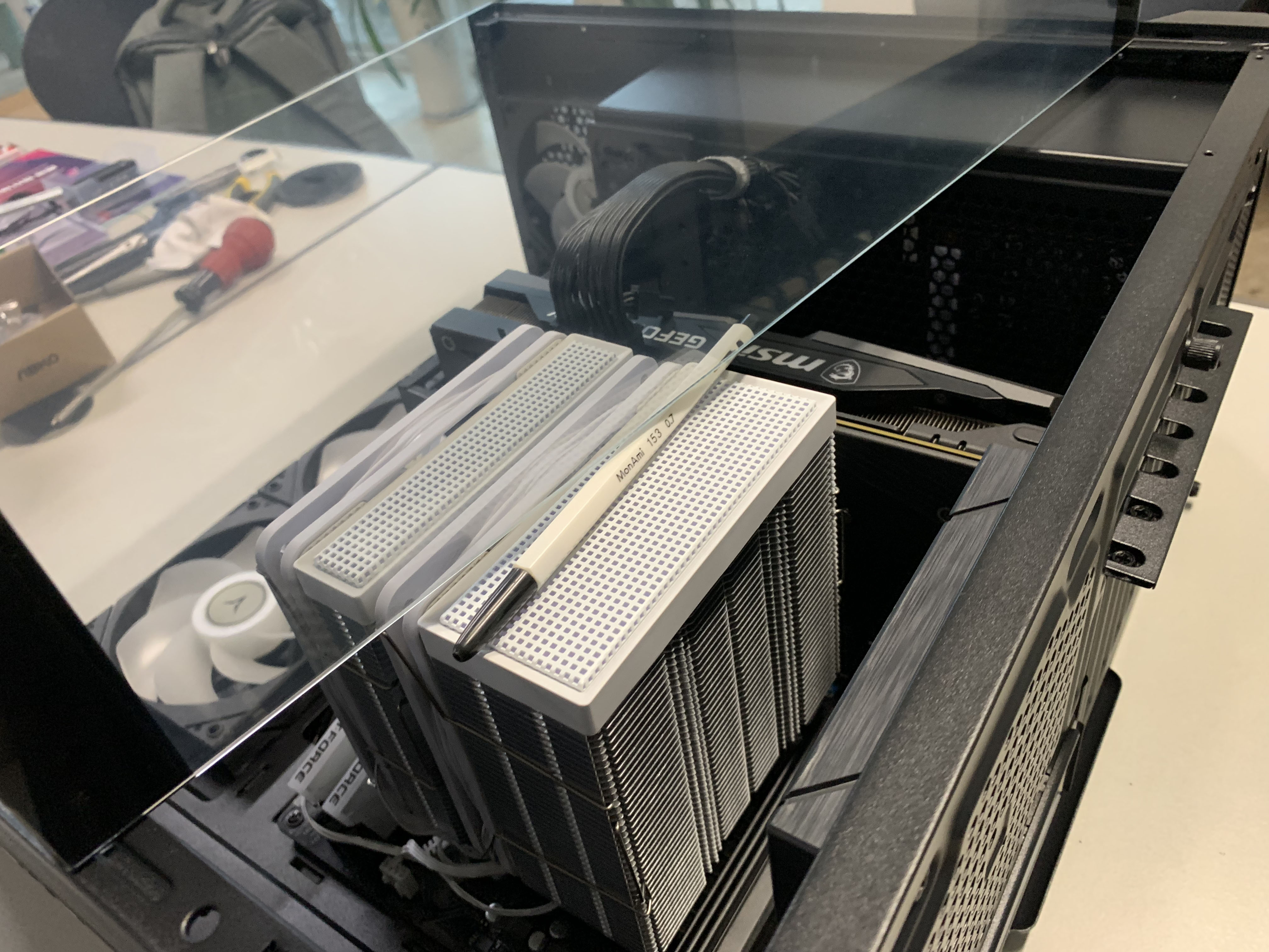 테스트에 사용한 CPU쿨러는 높이가 157mm인데, 강화유리와 CPU쿨러 사이에 볼펜 두께가 하나 들어가고도 남을 만큼 여유로우며, 앱코 UH40 킬러웨일 ARGB 케이스가 최대 165mm 지원한다는것을 실감할 수 있습니다.
