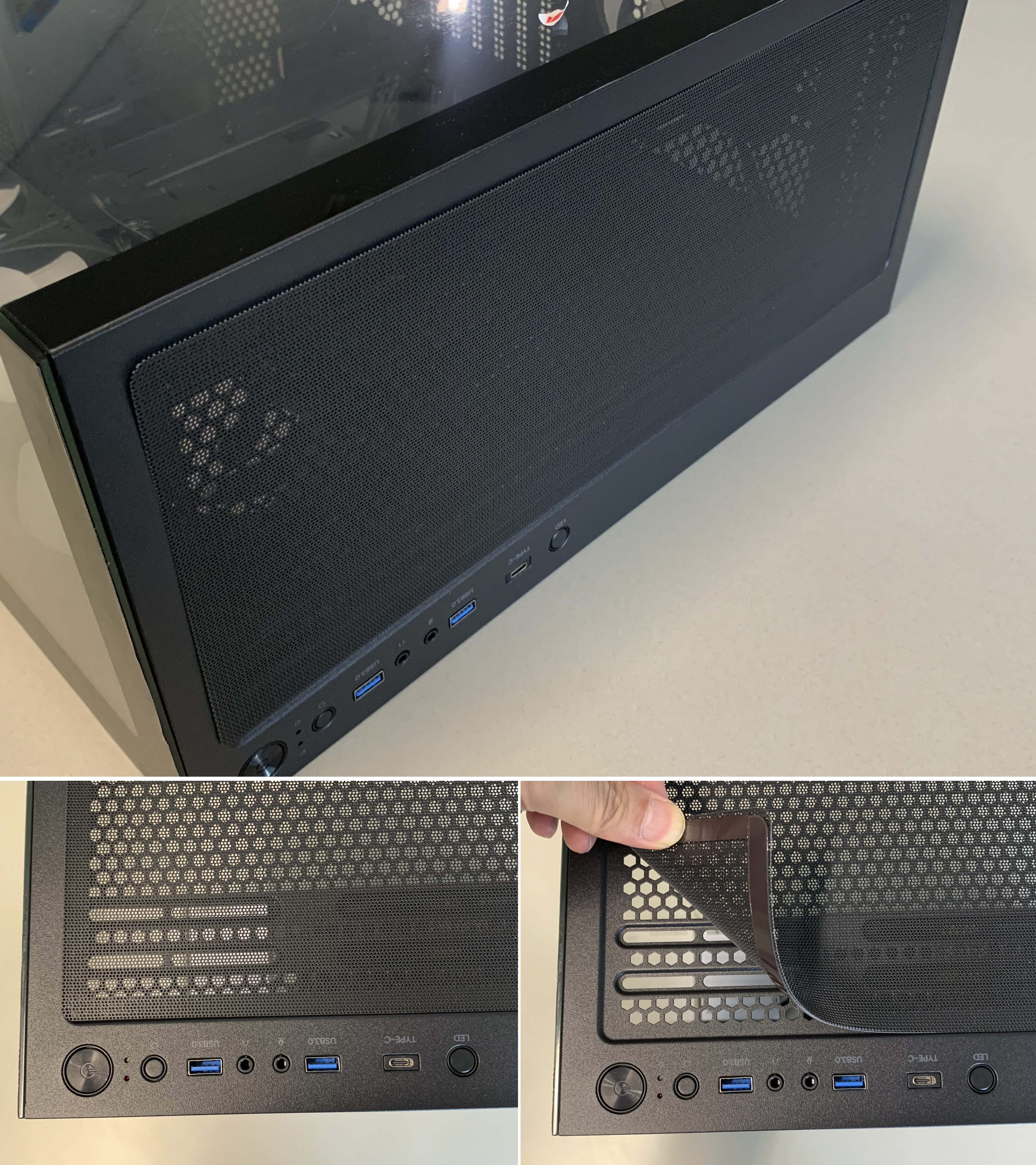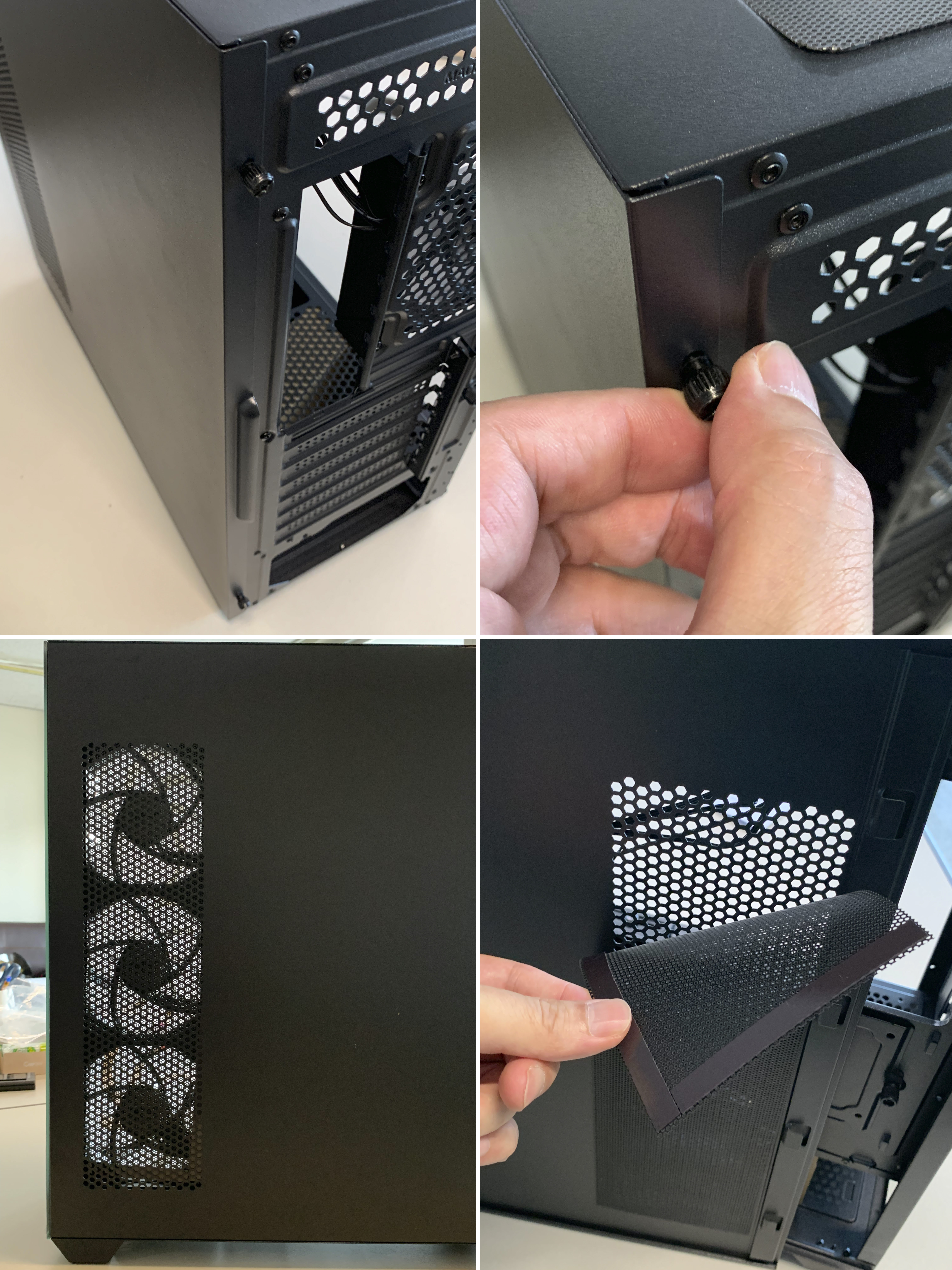 측면 패널 또한 손나사를 이용하여 도구 없이 쉽게 탈부착이 가능하며, 마그네틱 먼지 필터가 내부에 부착되어 외부 먼지로 부터 내부 부품 보호하고, 쉬운 탈부착 방식이라서 먼지 청소가 편리합니다.
