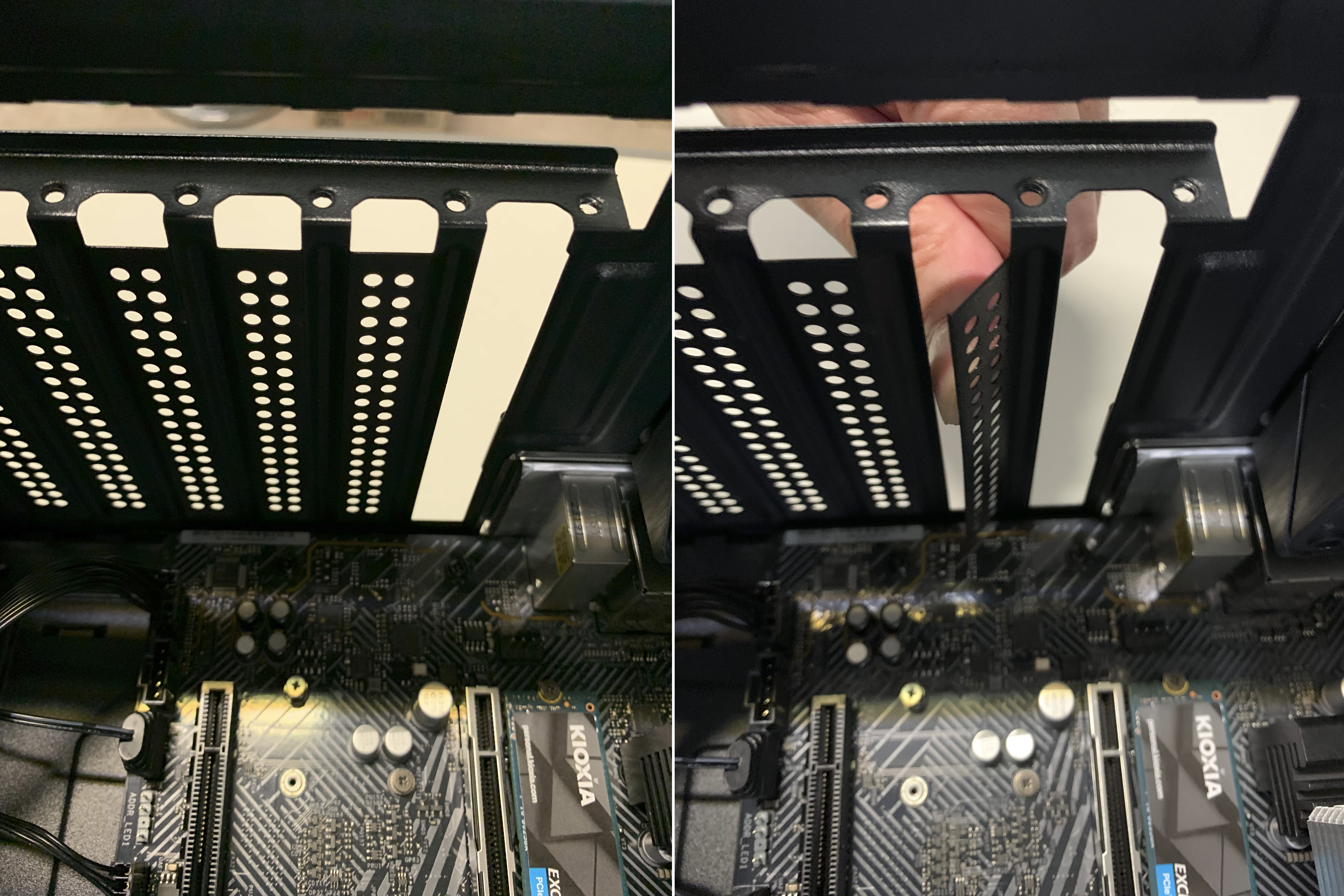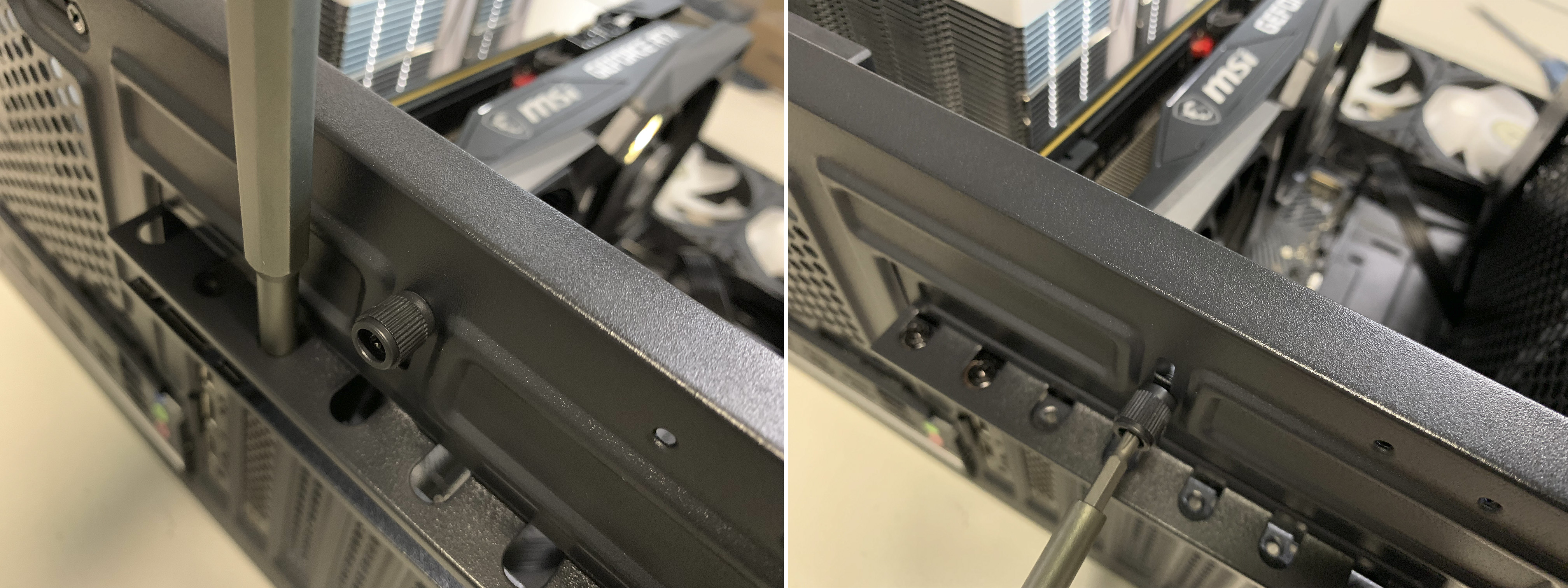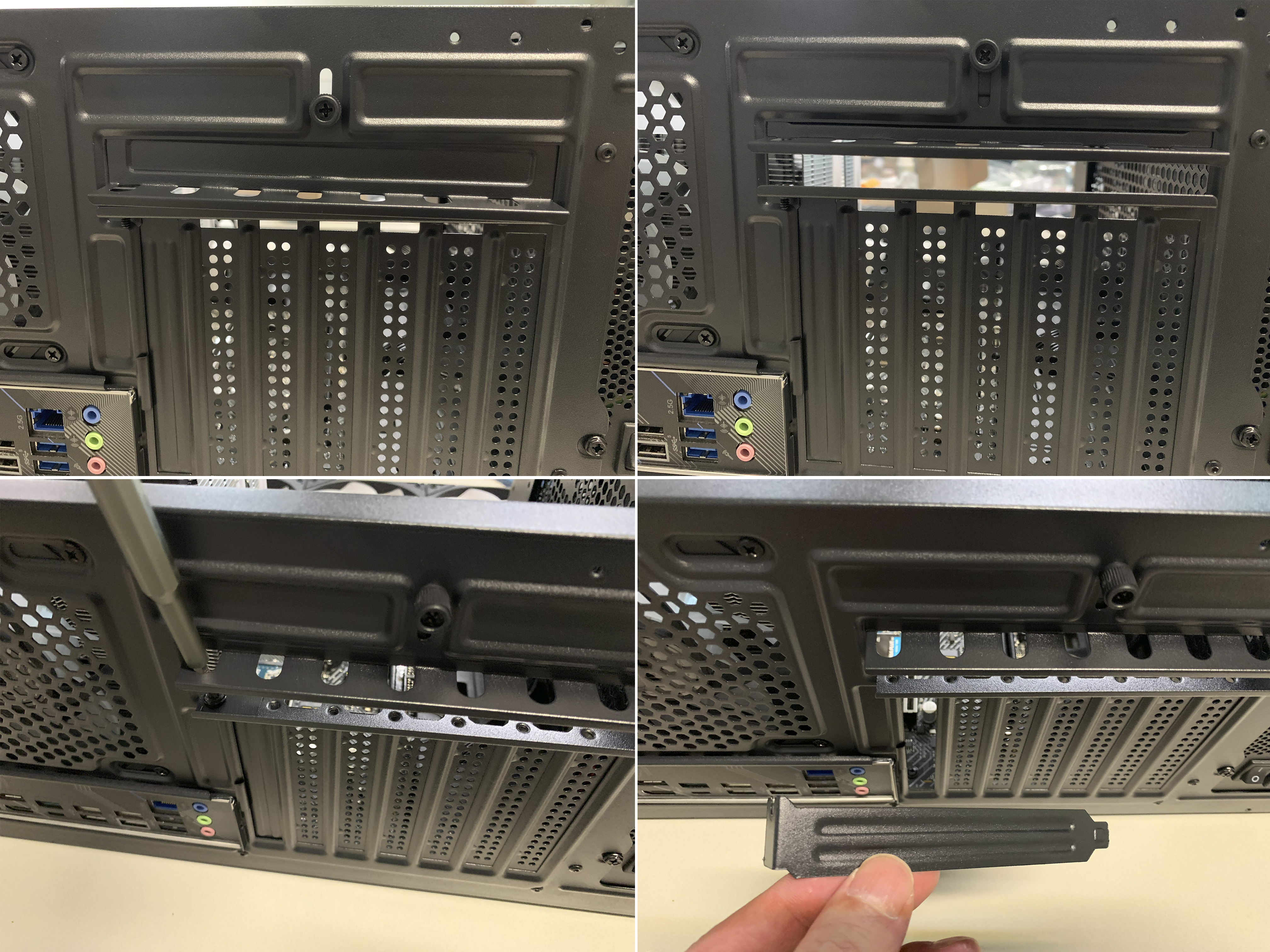 PCI 슬롯 하나는 나사를 풀고, 다른 하나는 손으로 밀어서 분리한 다음, 그래픽카드를 장착 및 고정 합니다.