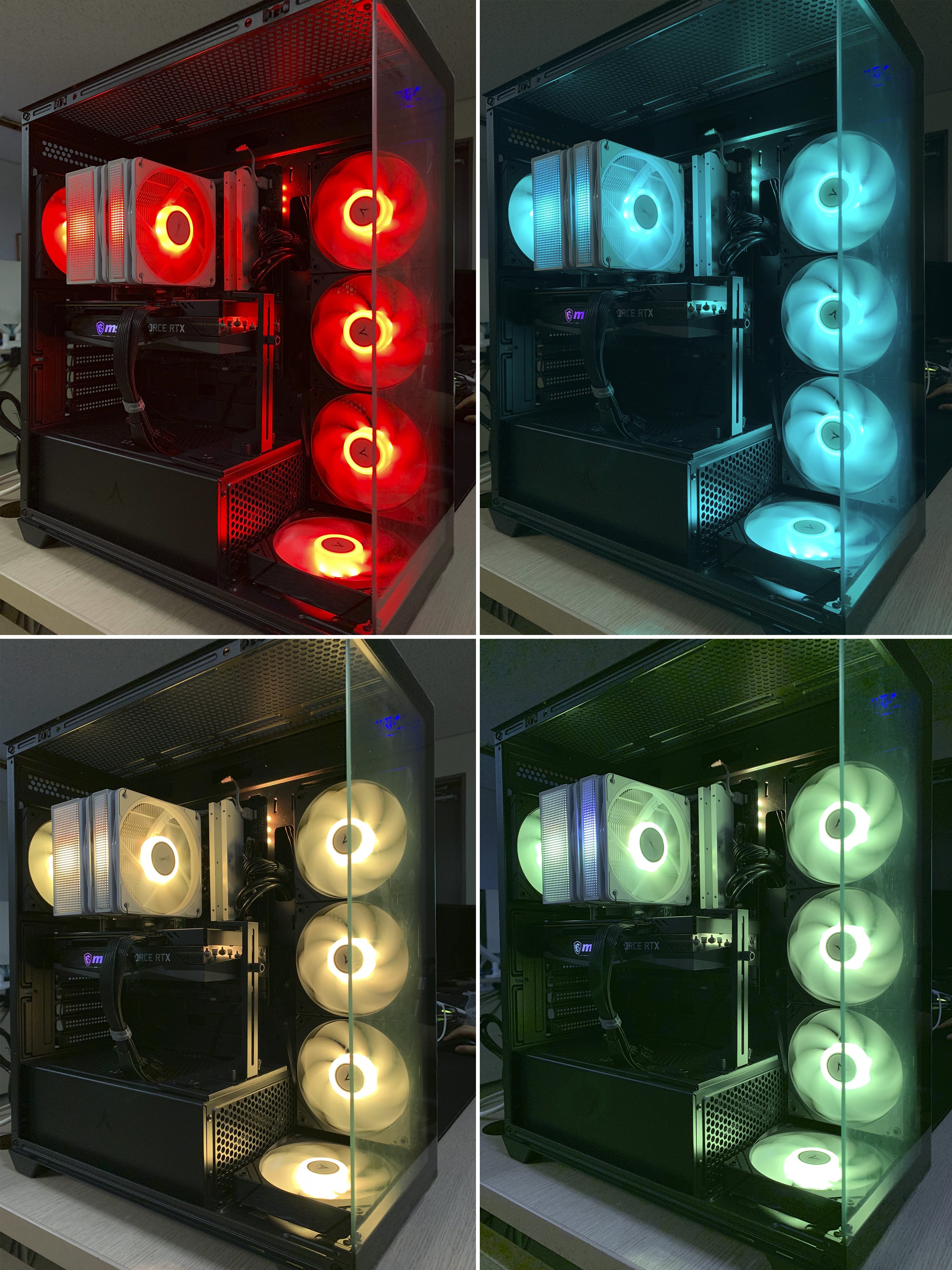 120mm ARGB 쿨링팬은 메인보드 5V 3핀에 연결하여 LED의 다양한 패턴과 컬러를 사용자의 취향대로 튜닝이 가능하며, 후면 정방향 1개, 측면 역방향(리버스) 3개, 하단 역방향(리버스) 1개로 총 5개의 쿨링팬이 기본 제공됩니다.