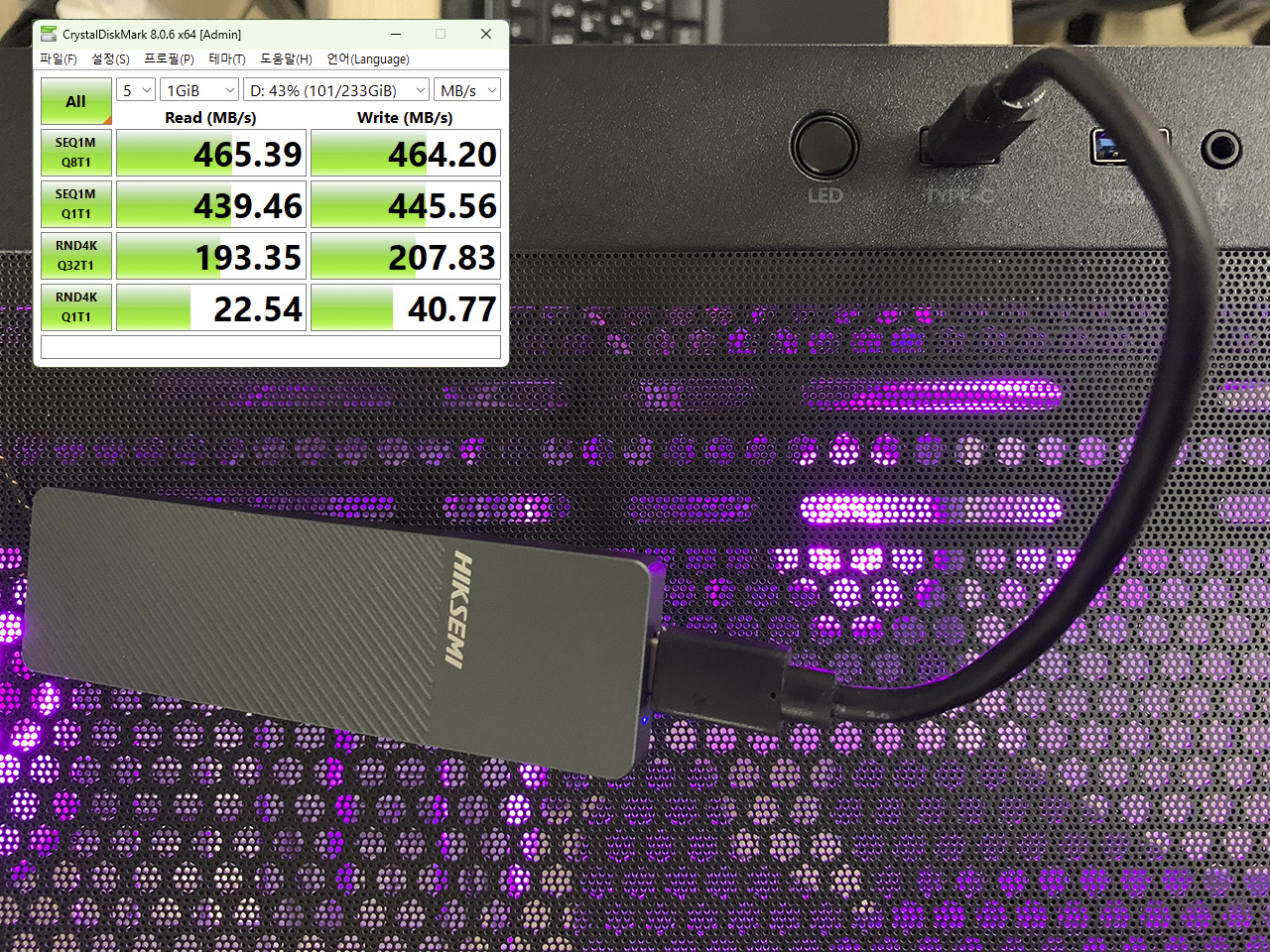 앱코 UH40 킬러웨일 ARGB 케이스의 USB3.2 TYPE-C는 최대 20Gbps를 지원합니다.