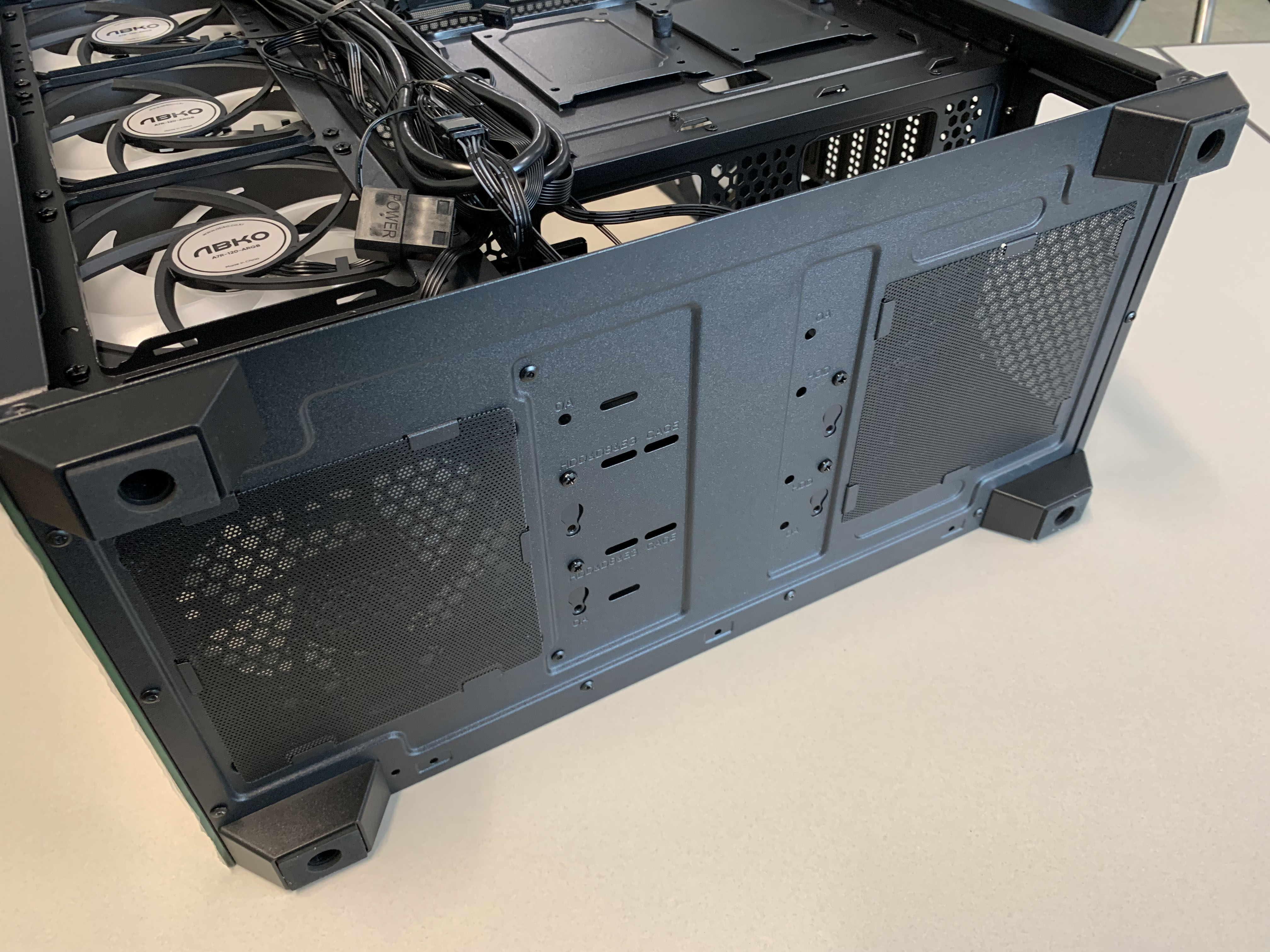하단에는 미끄럼 방지패드와 탈부착 가능한 먼지 필터가, 파워서플라이와 하단 리버스 쿨링팬 각각 1개씩 있습니다.