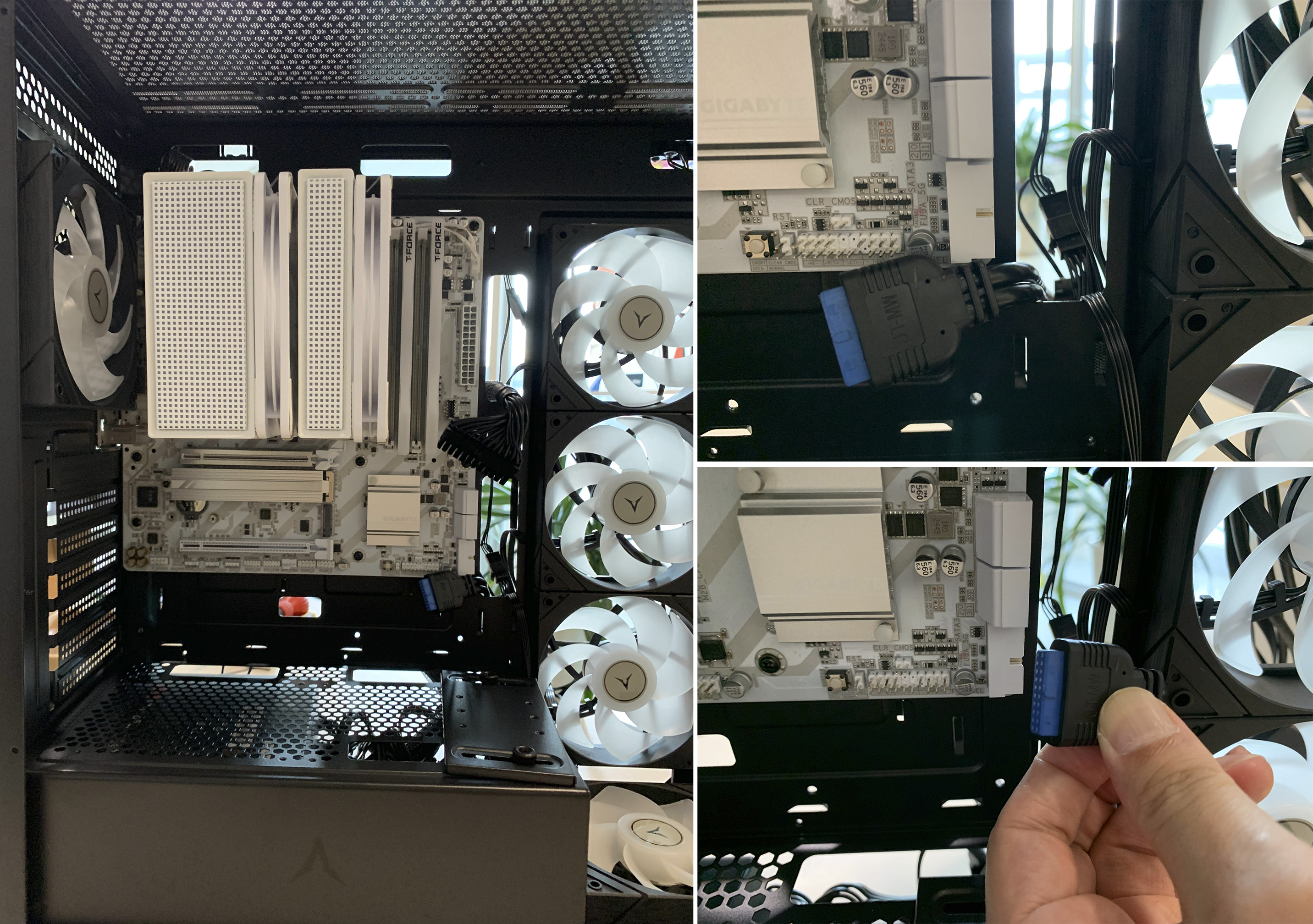 메인보드 중에 USB 3.0 헤더가 세워진 타입이 아니라 옆으로 누운 제품들이 있는데, 사진처럼 측면 쿨링팬과 간섭으로 케이블을 설치할 수 없는 일이 발생했습니다. 최근 메인보드가 시스템 튜닝을 위해서 옆으로 누운 제품이 출시되고 있으니, 메인보드 구매시 간섭이 발생하지 않는지 확인해 보시길 바랍니다.
