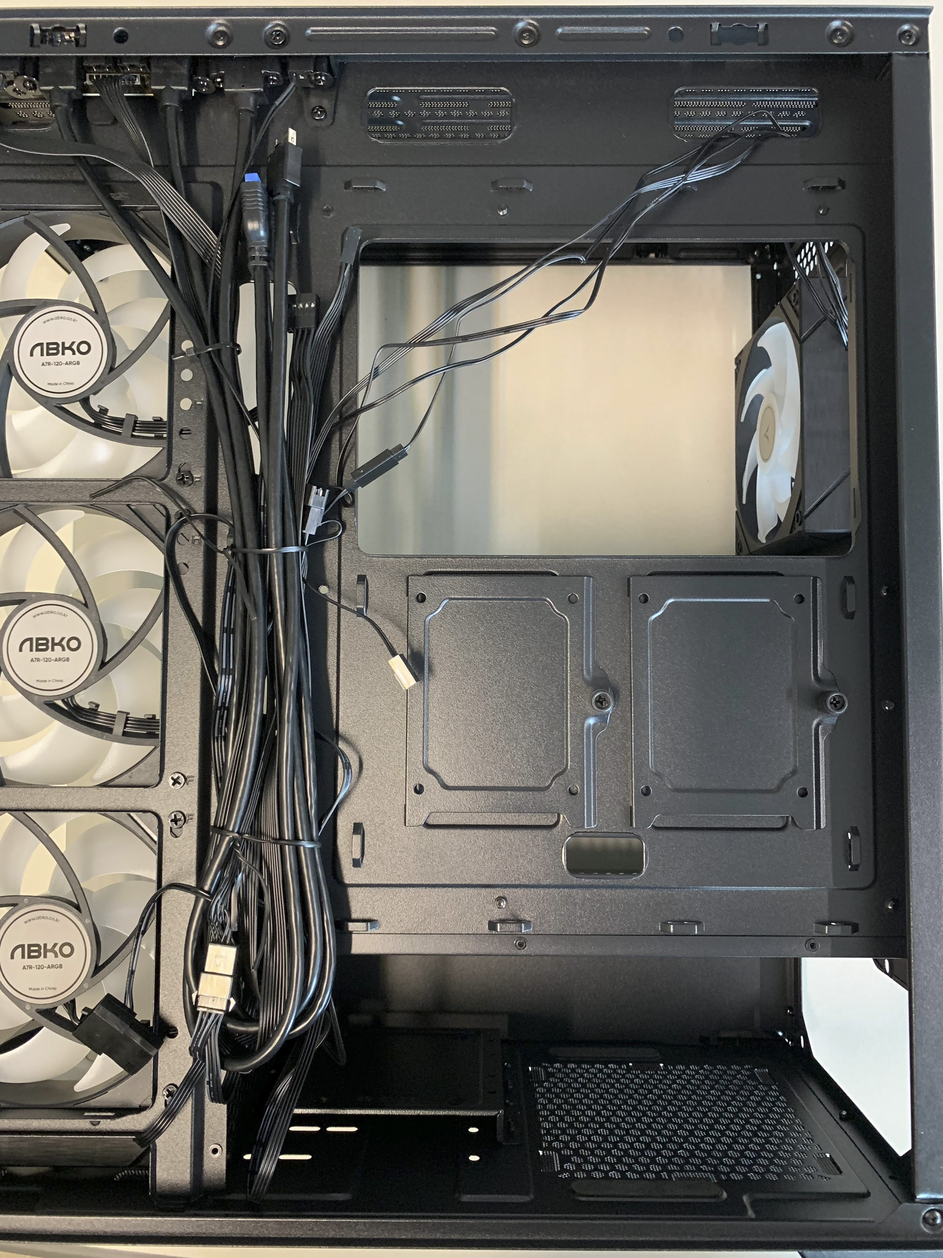 케이스 뒷면 오른쪽에는 케이블이 넉넉하게 들어갈 공간이 있어서, CPU 보조전원 및 쿨링팬 케이블을 깔끔하게 선정리할 수 있으며, 하단에는 파워서플라이 공간이 별도로 분리되어, 풀모듈러가 아니라도 남은 케이블을 잘 정리 할 수 있습니다.