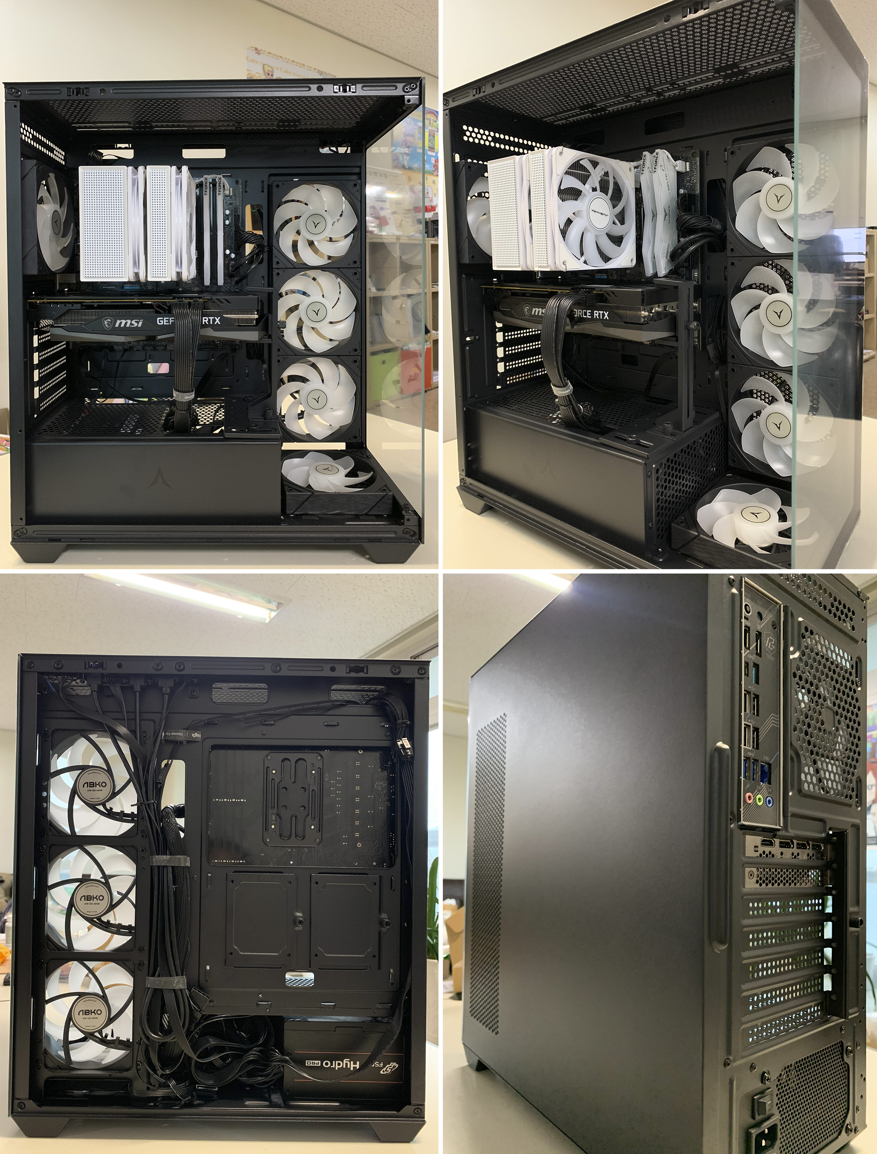 조립에 실패한 메인보드를 분리하고 다른 메인보드 제품에 CPU, CPU쿨러, 램 메모리를 다시 설치하고, 앱코 UH40 킬러웨일 ARGB 케이스에 고정했습니다. 24핀 전원, 8핀 보조전원, Type-C, HD-Audio 등 케이블을 각각 연결한 모습입니다.
