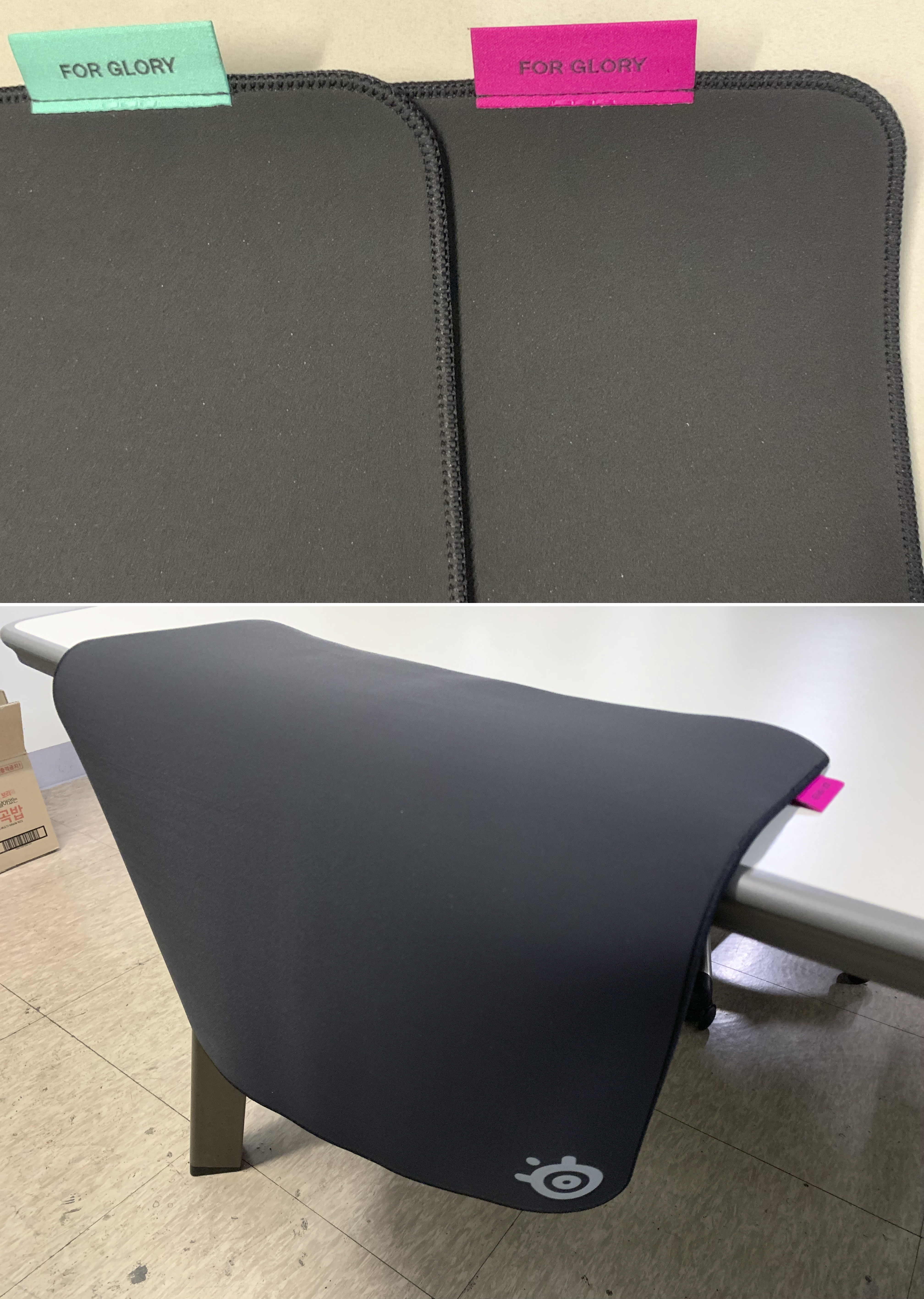 사진상으로는 포장 박스가 주황색으로 알록달록하고 스틸시리즈 아이콘이 귀여워서 사이즈가 작다고 착각 할 수도 있을거 같아서 일반적으로 사용하는 장패드와 나란히 두고 사진을 촬영해보았습니다. XL사이즈(900 x 400mm)는 L사이즈의 두배니까 책상을 거의 덮을 정도로 크다는 걸 알 수 있습니다.