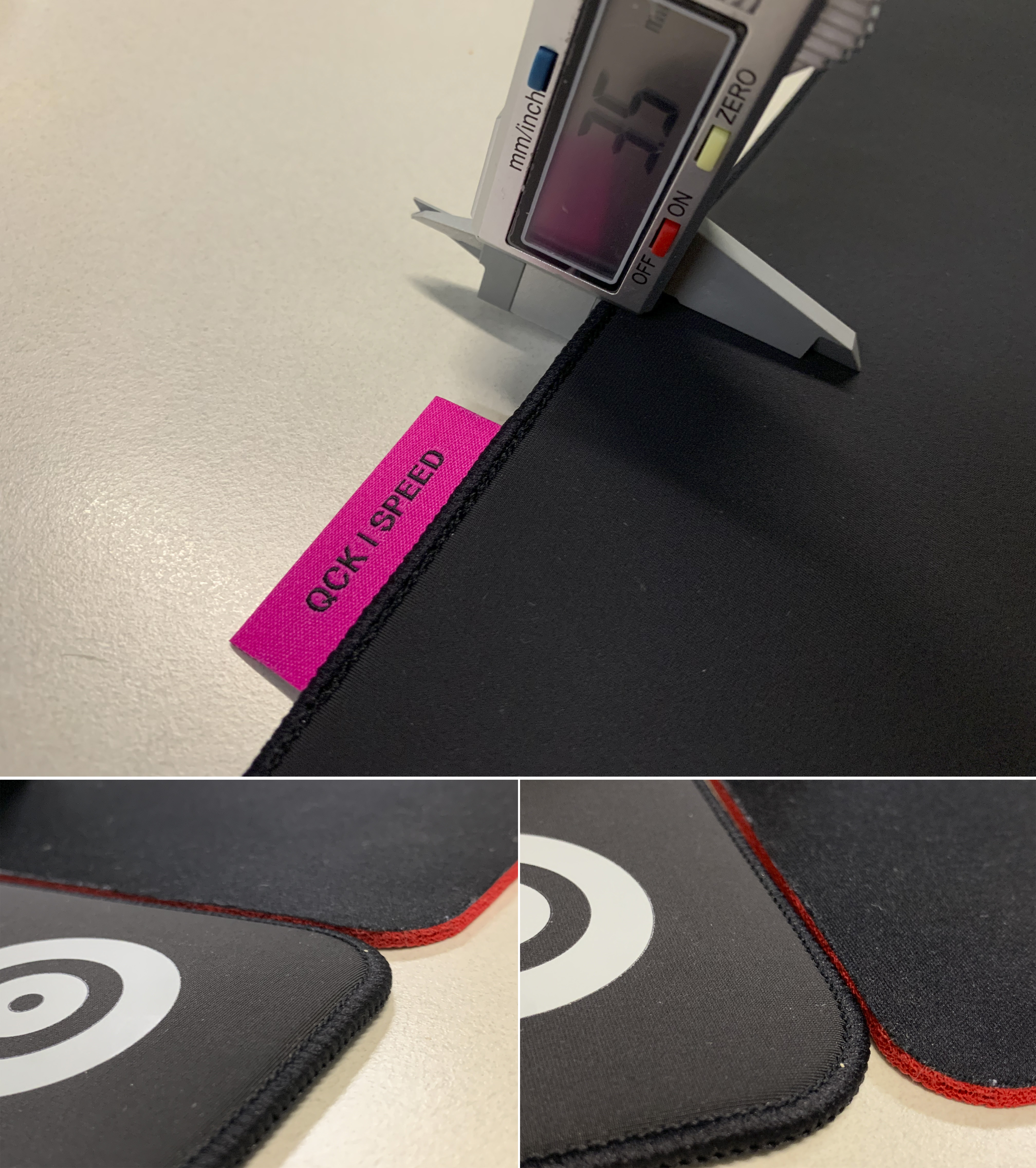 사용중이던 마우스패드 보다 약간 더 얇은 편이며, 실제 두께를 측정할때, 힘을 주고 쎄게 조여서 측정하면 약 3.2mm, 살짝 느슨하게 측정할 경우 약 3.6mm정도일 정도로 실제 만져보면 타이트하지 않고 조금 말랑말랑한 느낌이 듭니다.