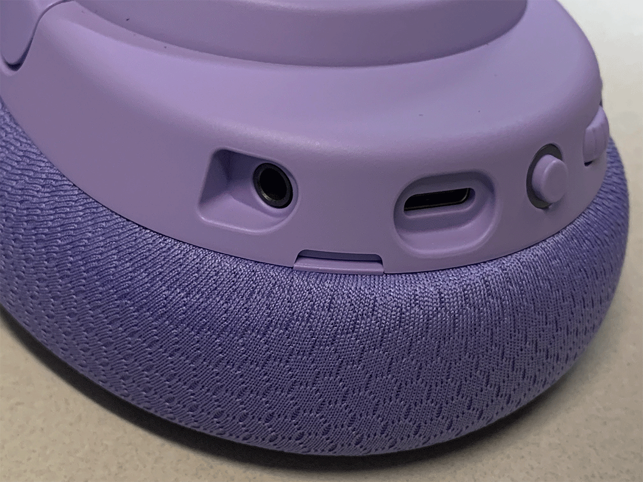 왼쪽에서 부터 마이크 포트, C포트, 전원 버튼, 볼륨 조절 휠, 음소거 버튼이 배치되어 있습니다.