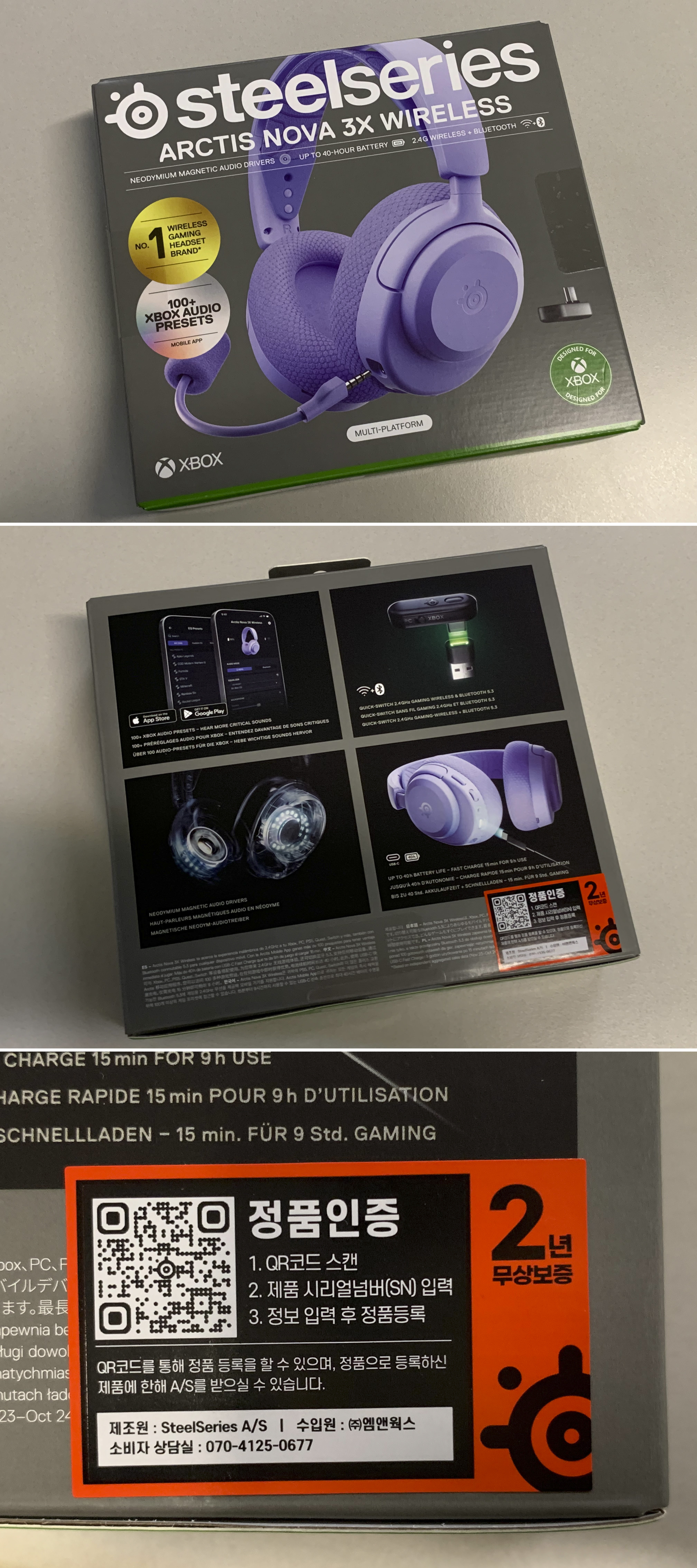 박스에는 Arctis Nova 3X Wireless의 특징을 살펴 볼 수 있으며, 리뷰하는 제품은 라벤더 컬러 제품입니다. 박스 뒷면에는 공식유통사 (주)엠앤웍스 2년 AS 스티커가 붙어 있습니다.