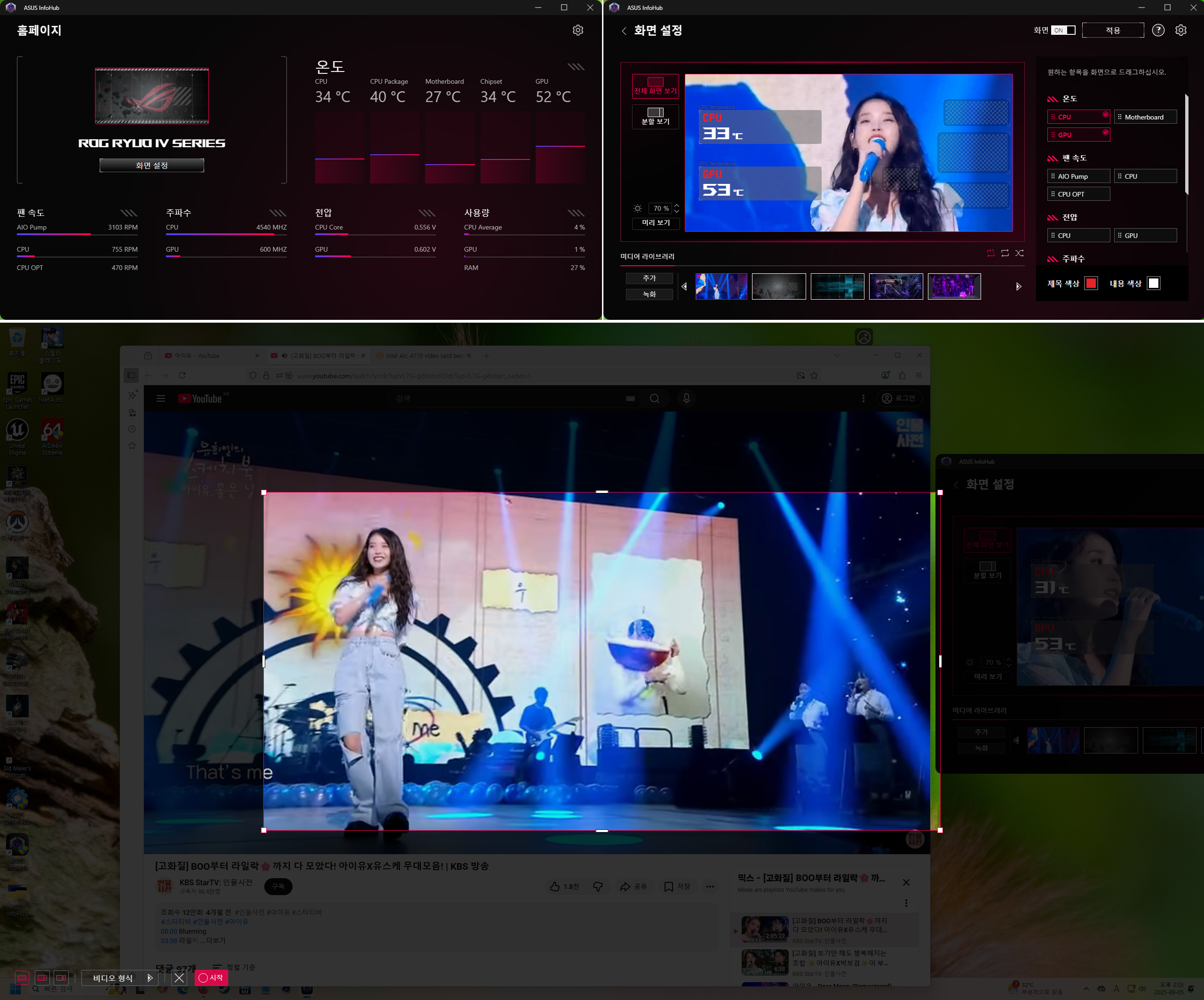 ASUS InfoHub의 녹화 기능을 활용하여, YouTube 임의 영상을 녹화 후 디스플레이에 적용시켜보았습니다.