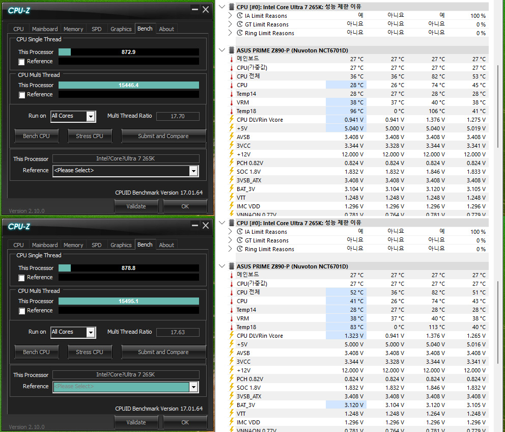 벤치테스트 2회 실행시, 싱글/멀티는 1회 872.9점 / 15446.4점, 1회 878.8점 / 15495.1, 최대 온도 74도가 측정되었습니다.