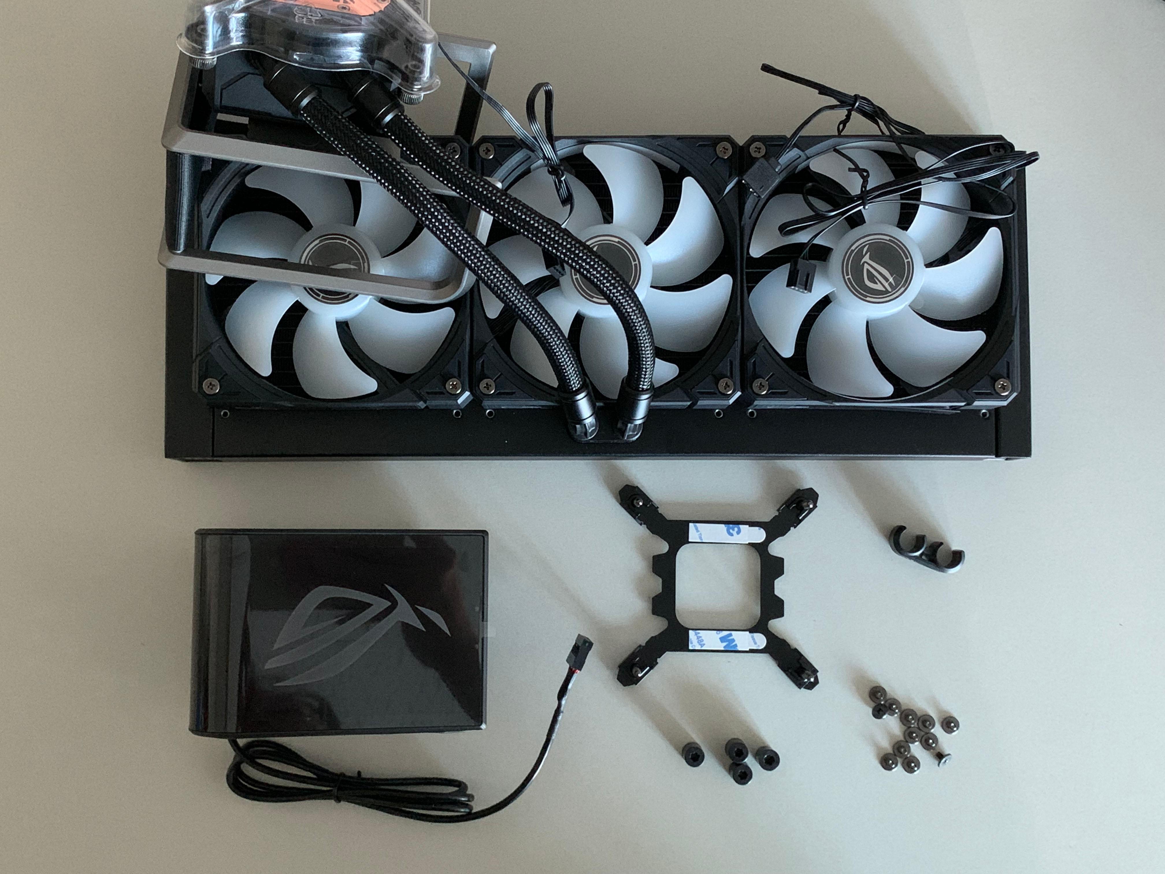 패키지는 3개의 팬이 장착된 라디에이터, 조립설명서, 디스플레이, CPU 제조사별 브라켓, ROG 스티커, 튜브 클립 등으로 구성되어 있습니다.