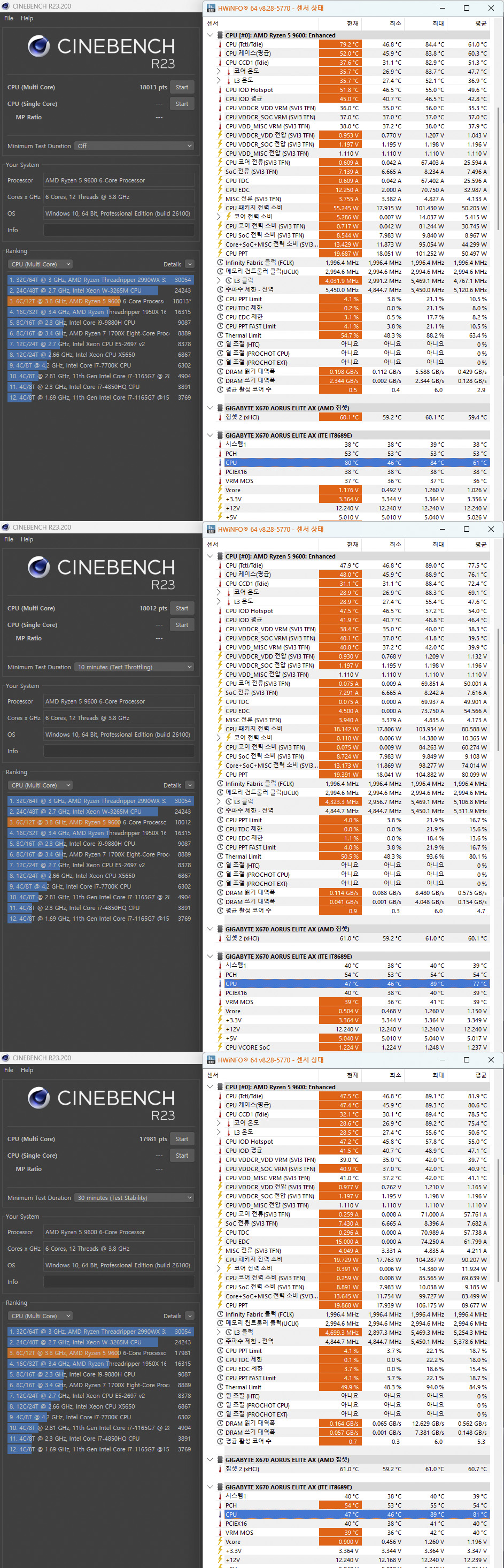 - PBO Curved Optimize에서 All Core -30, 램 EXPO 6000MHz CL30 설정한 상태에서, Cinebench R23 1회, 10분, 30분 실행시, 안정적으로 온도를 잡아주었으며, 오히려 30분간 진행한 테스트에서 가장 높은 점수를 기록했습니다. 상위 CPU 라이젠7 9700X까지도 무난하게 사용할 수 있을것으로 판단됩니다.