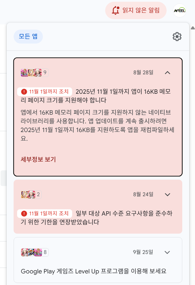 얼마전까지는 앱 타겟을 API 35이상으로 수정하라고 경고를 해서, 수정완료했습니다.