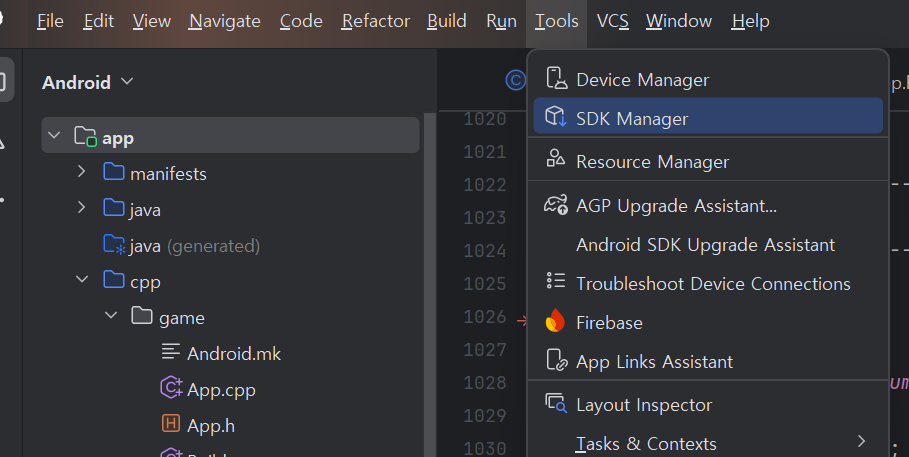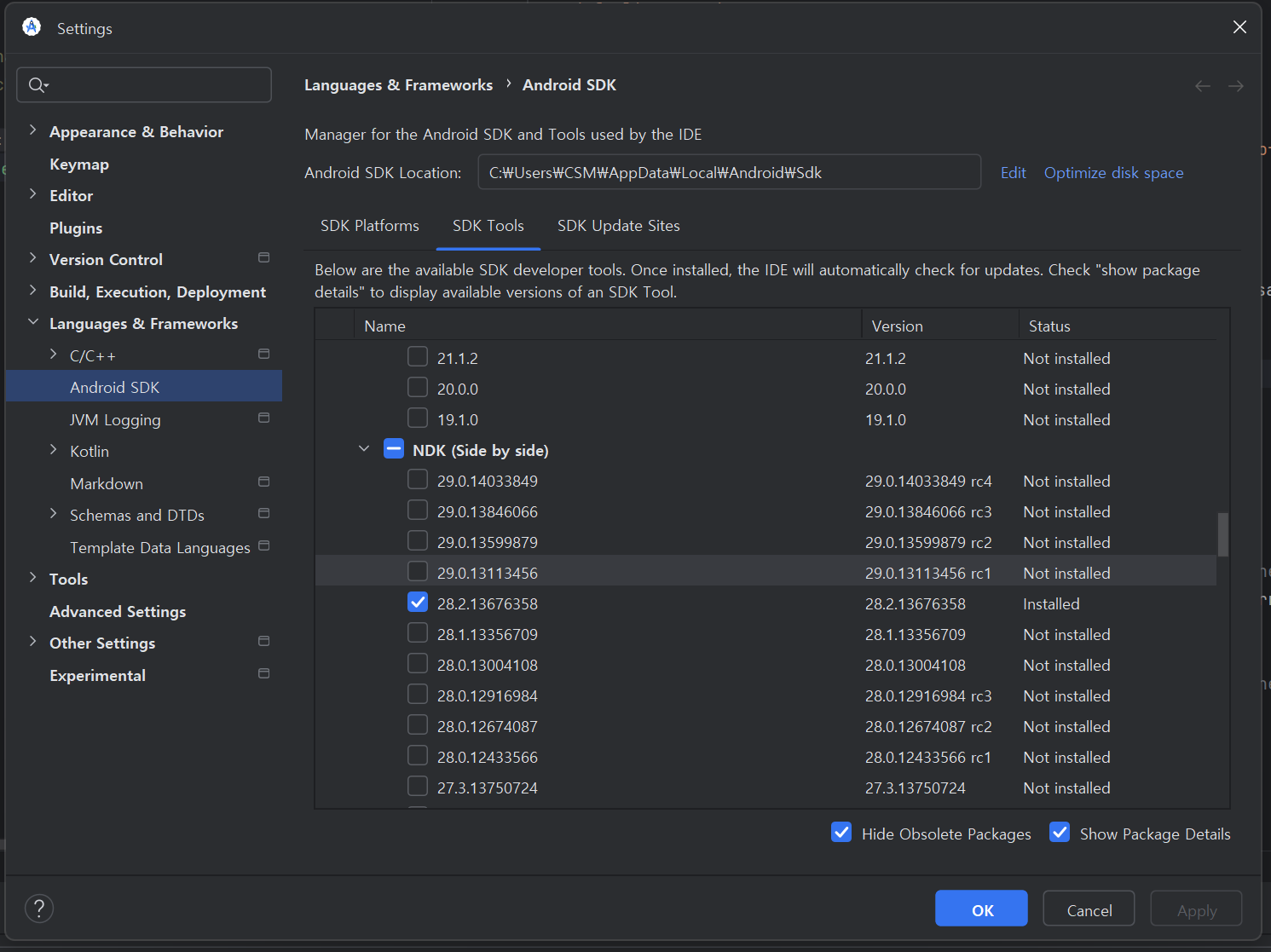 - NDK 버전은 Tools > SDK Manager로 Settings창을 띄웁니다. 오른쪽 하단 Show Package Details를 눌러서 필요한 버전을 (rc가 붙은 버전을 피해서) 받으시면 됩니다.