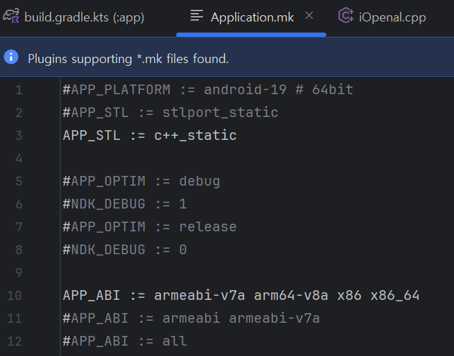 - Application.mk에 해당 옵션을 넣습니다. 64비트 지원 대상이기 때문에, arm64-v8a이나 x86_64이 없으면, 해당 단말기 혹은 에뮬레이터에서 지원하지 않는 앱이라면서 설치가 되지 않습니다.