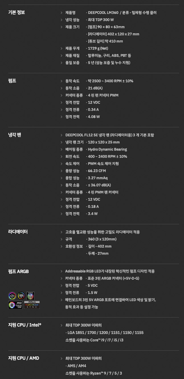 뒷면에는 한눈에 알아 볼수 있도록 스펙이 자세히 나와 있습니다. 스펙을 간단히 살펴보면, 인텔 LGA 1851/1700 /1200/1151/1150/1155, AMD AM5 / AM4 소켓을 지원하며, TDP 300W, 라디에이터 사이즈 402 X 120 X 27mm, Hydraulic 베어링 쿨링팬 120mm 3개, 최대 2400RPM, 풍량 66.23CFM, 소음 36.07dBA, 3.27 mmH2O, 총 5년의 무상 보증 기간 제공 + 누수 피해 하드웨어 보증입니다.