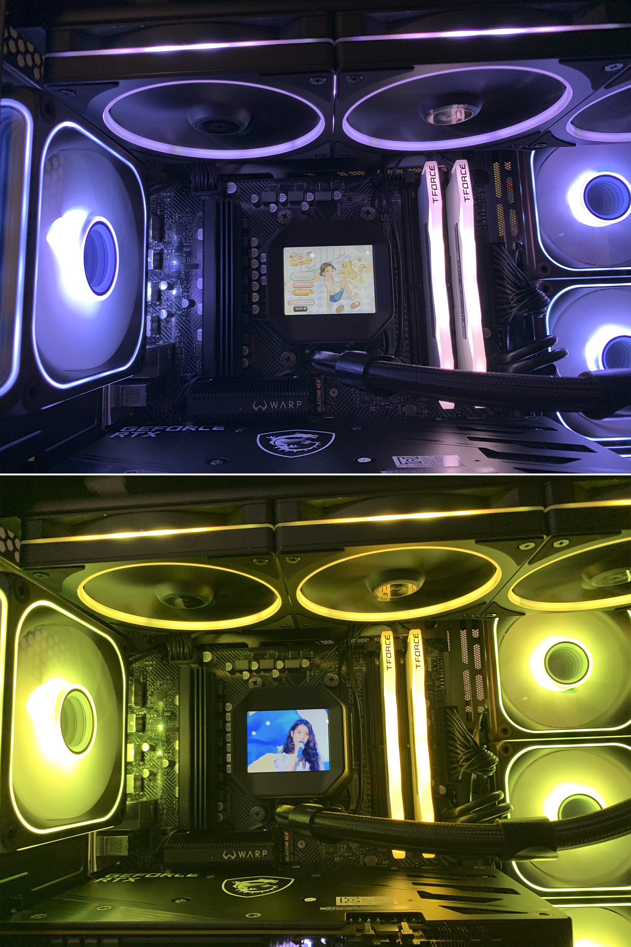 - 메인보드에서 지원하는 소프트웨어에서 다양한 RGB 모드와 컬러 변경으로 멋지게 튜닝할 수 있어서 개방감이 좋은 어항케이스에서 더욱 예쁘게 연출할 수 있습니다. 또한 실시간으로 CPU 사용률, 클럭 등 정보를 LCD디스플레이에서 모니터링이 가능하고, 취항에 따라 이미지(JPG, PNG, GIF) 및 동영상(MP4) 등을 표현할 수 있어서 감성 시스템을 완성할 수 있었습니다.