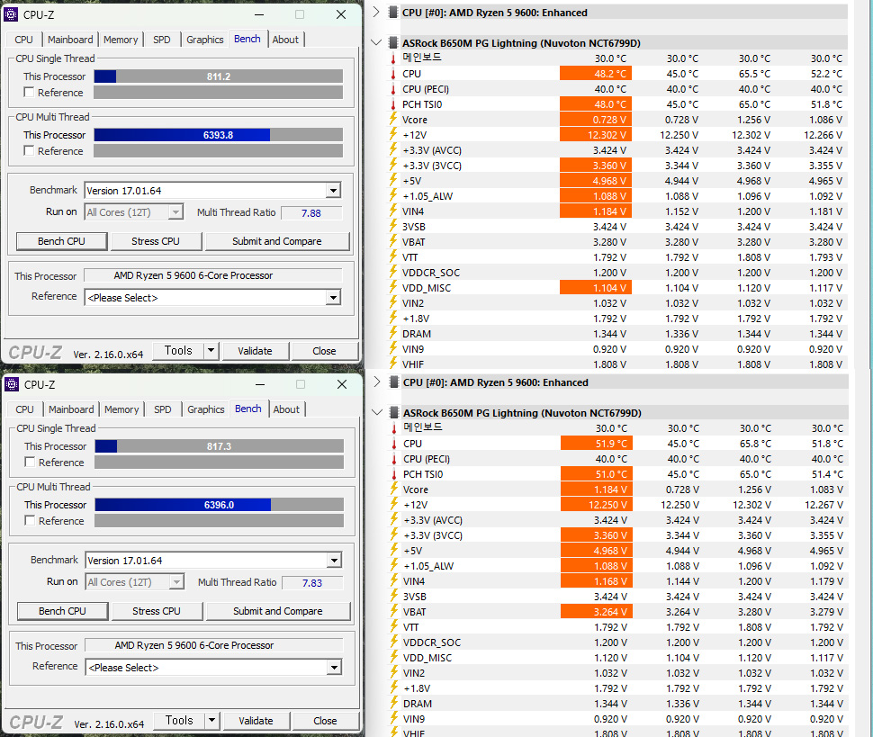 벤치테스트 실행시, 1회 싱글 811.2 멀티 6393.8점, 2회 817.3 멀티 6396.0점이 측정되었습니다.
