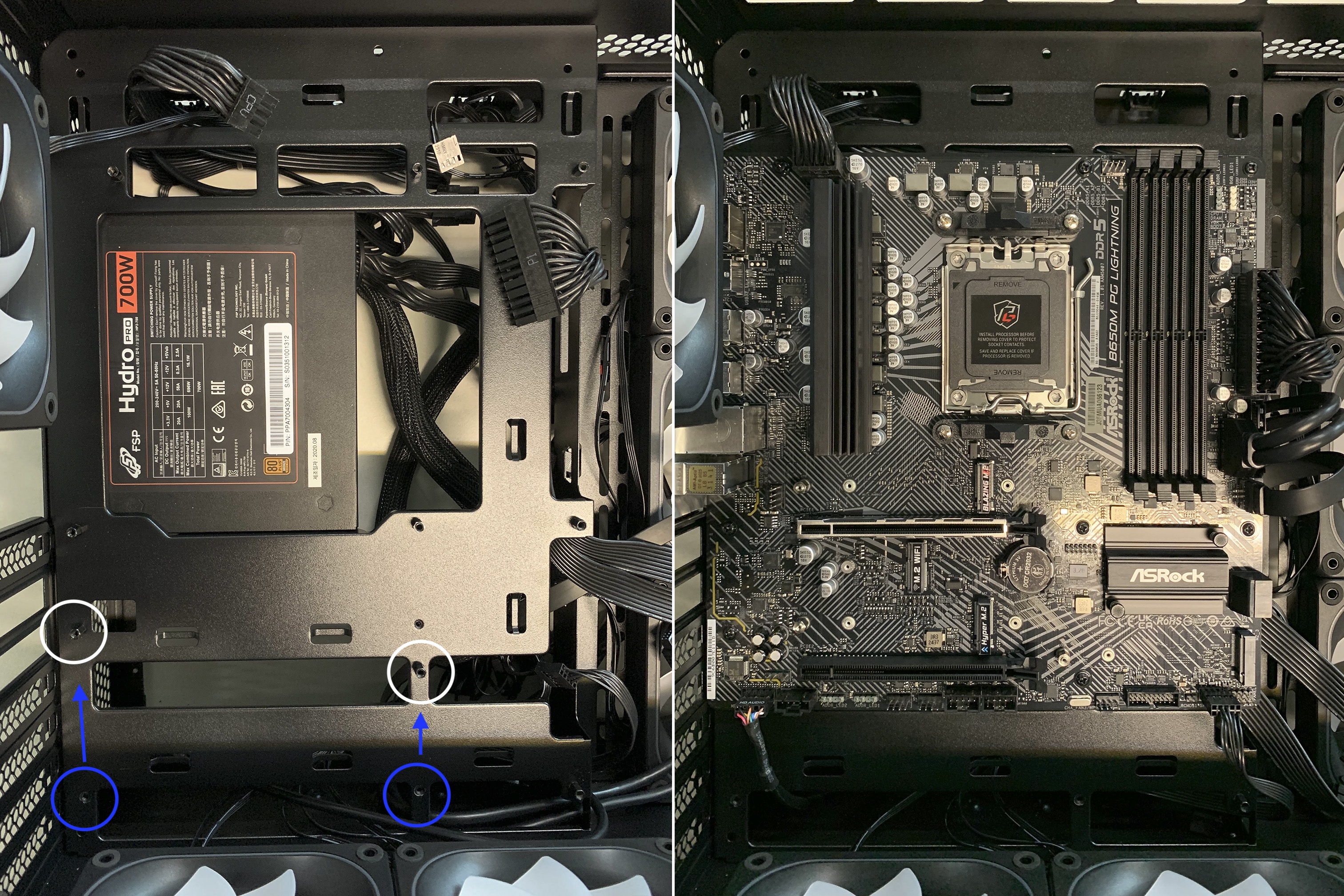 ASRock B650M PG Lightning 메인보드 폼팩터(M-ATX)에 맞게 스탠드오프를 옮기고 메인보드를 설치했습니다.