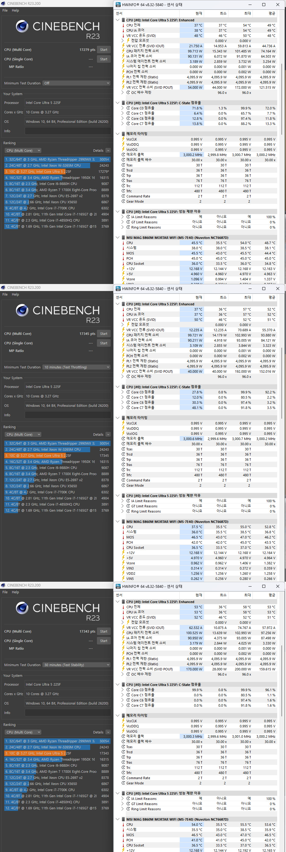 CINEBECH R23 프로그램에서 1회, 10분, 30분 실행한 결과입니다. 30분간 풀로드(과부하) 상태를 유지하더라도 점수차이는 거의 없으며, 온도를 포함한 모든 수치 또한 큰 변화없이 안정적입니다.