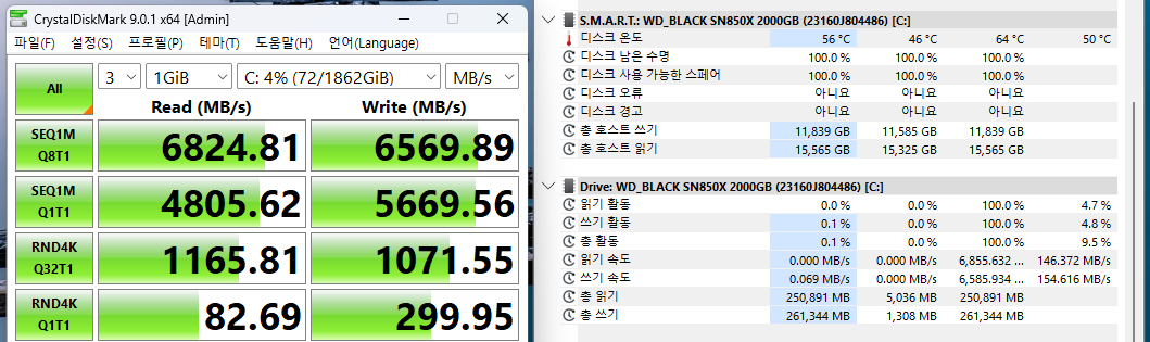 크리스탈 디스크마크로 첫번째 슬롯에 장착한 WD BLACK SN850X M.2 NVMe 2TB 실행한 결과입니다.