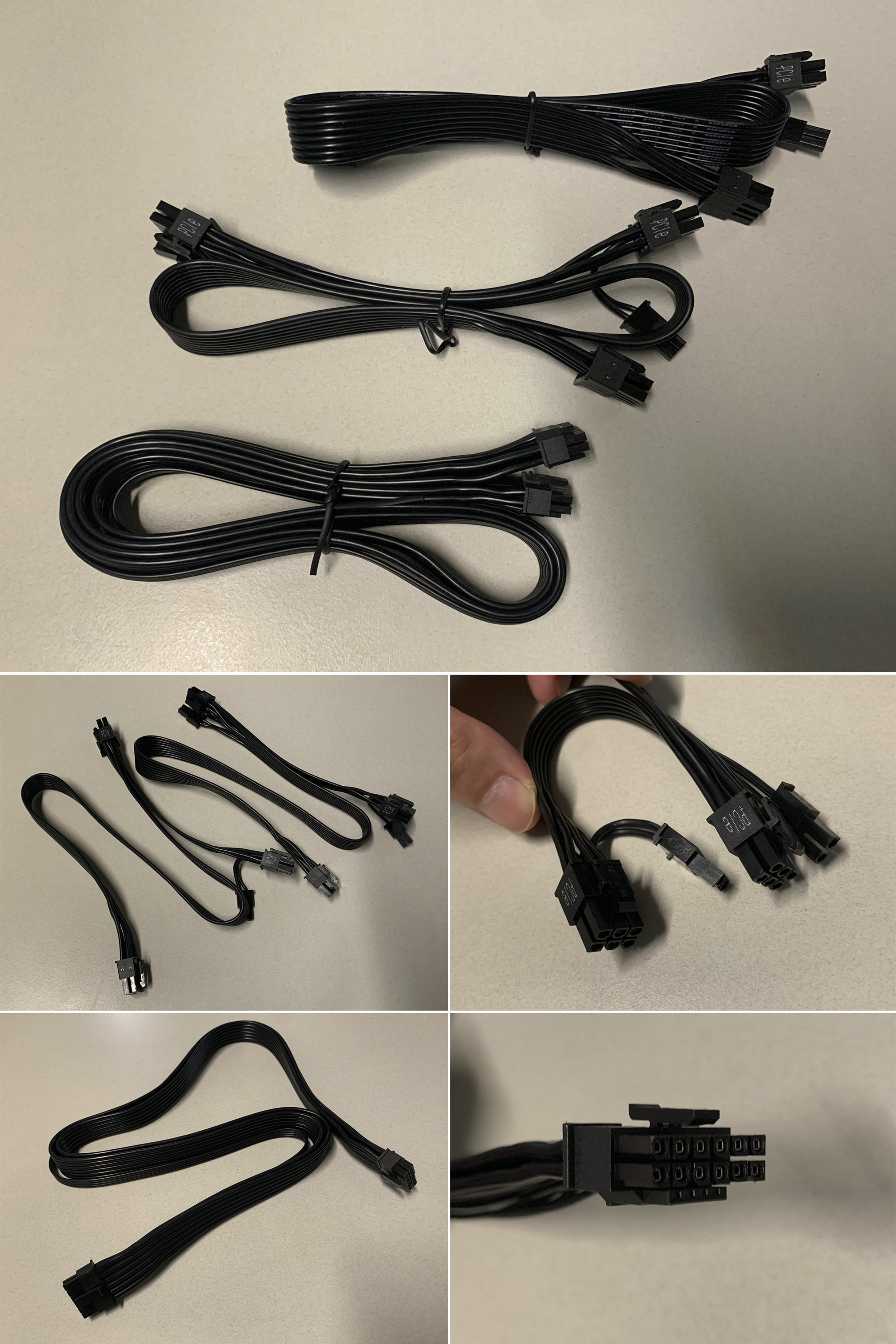 메인전원 24(18+6)핀, CPU보조전원은 8핀 2개, 2.5" SSD에 연결하는 SATA케이블은 2개(커넥터 8개), 쿨링팬에 연결하는 4핀 IDE케이블(몰렉스 케이블, 커넥터 4개)가 있습니다.