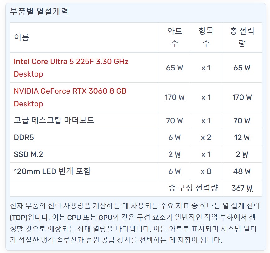 시스템에서 사용하는 전력량을 직접 측정할 수 있는 측정 기기가 없어서, 테스트 시스템 구성으로 예상 전력량 367W을 산출했습니다. 실사용에서는 인텔 코어 울트라5 225F는 최대 127W를 사용되기 때문에 벤치테스트를 진행하는 동안 약 430W가 적용되었습니다.