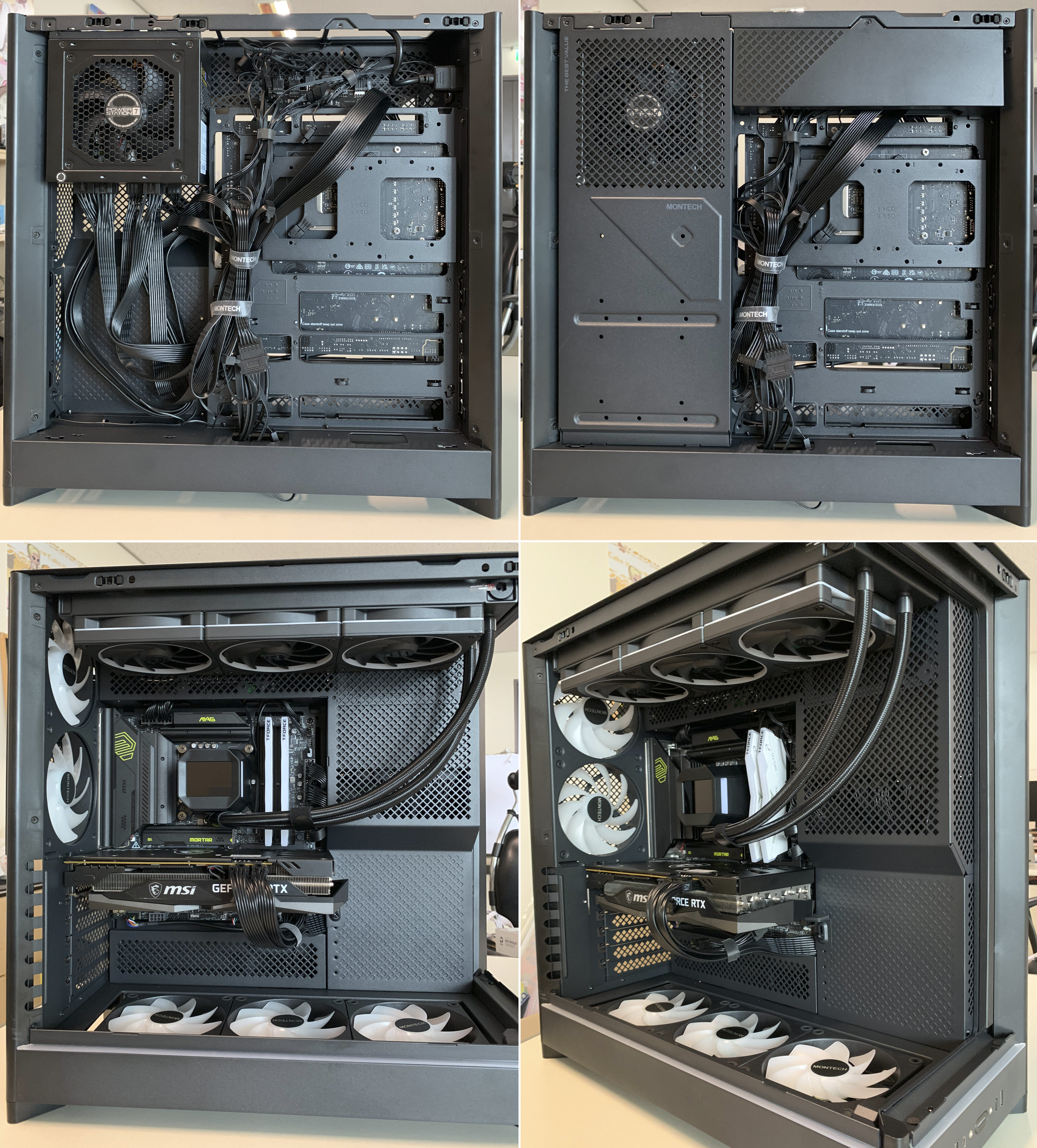몬텍 PC케이스 MONTECH HS02 PRO BTF필드테스트 2025. 10. 21. 01:33728x90이 체험기는 뉴젠씨엔티에서 제품을 제공받아 작성하였습니다.  패션의 완성은 얼굴이라는 말처럼, PC 조립의 완성은 PC케이스라 생각합니다. 작업이나 게임 플레이 환경에서 뛰어난 성능과 정숙함, 쾌적한 사양도 중요하지만, 나만의 공간에서 자리를 크게 차지하는 만큼 PC케이스의 디자인이 아주 중요합니다. 뛰어난 개방감으로 사용자의 취향에 맞게 시스템을 잘 꾸밀수 있는 어항케이스, MONTECH HS02 PRO BTF 리뷰 시작하겠습니다. 1. 제품소개 MONTECH HS02 PRO BTF는 블랙과 화이트 2종류 색상이 존재하며, 블랙 색상을 기준으로 소개하겠습니다. 스펙을 간단히 살펴보면, ATX/M-ATX/M-ITX 지원, 480 X 240 X 480mm(L x W x H) 크기의 미들타워이며, 후면 쿨링팬 120mm 2개, 하단 쿨링팬 120mm 리버스 3개 등 총 5개의 쿨링팬을 기본 장착되어 있습니다. 라디에이터 상단 120/240/360mm, 하단 120/240mm 설치 가능합니다. CPU 최대 높이 175mm, GPU 최대 길이 420mm, PCI 슬롯 7개, 3.5" HDD 최대 2개, 2.5" SSD 최대 4개 설치 가능합니다.   전체 구성품은 MONTECH HS02 PRO BTF 케이스 본품, 가이드, 6포트 ARGB Hub, 케이블 타이, 그래픽카드 지지대, 조립 악세사리 패키지로 구성되어 있습니다.  상단에는 최대 360 수랭 쿨러 라디에이터가 설치 가능하며, 마그네틱 먼지 필터가 있어서 먼지로 부터 내부 부품 보호하고, 도구 없이 손으로 쉽게 분리 가능하여 뛰어난 뛰어난 유지 관리 편의성을 기대할 수 있습니다.  하단에는 미끄럼 방지패드와 탈부착 가능한 마그네틱 먼지 필터, 하단 리버스 쿨링팬 3개가 있습니다.  측면 패널은 스냅방식으로 도구 없이 쉽게 탈부착이 가능하며, 측면 패널의 대부분을 벌집 모양의 구멍이 있어서 원활한 공기 흐름으로 쿨링에 최적화 설계되었습니다.  8도의 곡면 강화유리 전면 패널 설계로 시각적 방해를 최소화하여, 넓은 파노라마 뷰로 더욱 더 개방감을 살렸습니다. 전면/측면 강화유리는 모두 측면 패널과 동일하게 스냅방식으로 도구 없이 쉽게 탈부착이 가능합니다. 두께가 4.0mm로 측정되었고, 실제 강화유리를 분리해서 들어보면 묵직하고 안정감이 듭니다. 전면 하단에 있는 IO포트는 왼쪽에서 USB3.0 Type-A, USB3.0 Type-c, 마이크, 파워버튼, 오디오, LED버튼, USB3.0 Type-A 등으로 구성되어 있습니다.  120mm ARGB 쿨링팬은 메인보드 5V 3핀에 연결하여 LED의 다양한 패턴과 컬러를 사용자의 취향대로 튜닝이 가능하며, 후면 정방향 2개, 하단 역방향(리버스) 3개로 총 5개의 쿨링팬이 기본 제공됩니다.  케이스 후면에는 대부분 벌집모양으로 공기흐름을 위한 쿨링에 최적화 했으며, 컴퓨터 케이스 내부 열을 효과적으로 제거하기 위해서 후면 쿨링팬이 2개인 점이 인상입니다. PCI슬롯 7개를 지원하는데, 모두 탈부착 가능하고 재사용가능합니다. 3.5" HDD를 최대 2개, 2.5" SSD를 최대 4개가 설치가 가능하며, 측면에는 6포트 ARGB가 기본 제공되어 조립 및 선정리할때 편합니다.  2. 조립 MONTECH HS02 PRO BTF 측면에 있는 파워서플라이 브라켓을 먼저 분리합니다. 고정나사로 브라켓을 장착한 파워서플라이는 브라켓이 원래 있었던 위치에 설치합니다. 패키지에 포함된 내부 전원 케이블을 설치한 파워서플라이에 연결합니다. (조립이 서툰 초보자에게는 혹시 어렵게 느낄 수도 있지만, 오픈케이스 사용하던 기분이 들어서 조립이 재미있습니다.)  테스트 시스템에 사용할 MSI B860M 박격포 WIFI 메인보드에 맞게 스탠드 오프 2개를 추가로 설치했습니다.   메인보드를 장착하고 CPU쿨러, 램 메모리를 설치했습니다.  PCI 슬롯 2개를 분리 후, 그래픽카드를 설치합니다. 패키지에 포함된 그래픽카드 지지대를 설치했습니다. 크기가 크지 않아서 쿨링팬 LED를 가리지 않을 뿐만 아니라, 무거운 그래픽카드를 안정적으로 고정할 수 있을만큼 튼튼한 느낌이 듭니다.  5V 3핀, PWM 4핀 등 2개의 케이블을 가진 ARGB 쿨링팬이 수랭쿨러까지 포함해서 총개수가 8개인 만큼 케이블 수가 많아 상당히 복잡해보이지만, 케이스 뒷면의 넉넉한 공간과 6포트 ARGB 허브로 깔끔하게 선정리를 할 수 있습니다. 듀얼챔버 케이스 특징상 측면 패널 공간이 넉넉한 장점이긴 하지만, MONTECH HS02 PRO BTF 케이스는 특히 더 여유롭다고 느꼈습니다. 파워서플라이 케이블은 풀모듈러가 아니라도 남은 케이블을 편하게 정리 할 수 있습니다.  3. 사용기전면 강화유리 아래 IO포트의 LED버튼으로 기본 내장된 29가지 스타일의 ARGB 라이팅 모드를 커스트마이징 가능합니다. LED 버튼을 3초이상 누르면 기본 내장 혹은 메인보드 전용 소프트웨어 사이를 전환할 수 있습니다. 메인보드에서 지원하는 소프트웨어를 통해서 개인 취향에 맞게 LED모드와 RGB컬러를 셋팅할 수 있습니다.   MONTECH HS02 PRO BTF 케이스의 USB TYPE-C는 최대 10Gbps를 지원하는데, 크리스탈 디스크마크 프로그램으로 측정한 결과 10Gbps의 속도가 측정되었으며, 대용량 데이터를 옮기는 일이 잦더라도 쾌적하게 사용할 수 있습니다.  4. 마무리지금까지 MONTECH HS02 PRO BTF 케이스를 살펴보고, 조립 및 실사용을 해보았습니다. - 실사용하기 전까지는 쿨링팬 기본 5개 장착으로 외부로 부터 공기 유입이 약해서, 쿨