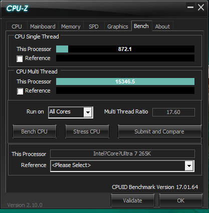 동일한 환경에서 CPU와 램 메모리를 최대한 오버클럭하고, NVIDIA GeForce RTX 4090과의 환경에서 최대 2127점이 측정되었던 적이 있는데, 인텔 코어 울트라7 265K는 오버마진이 높음을 알 수 있습니다.