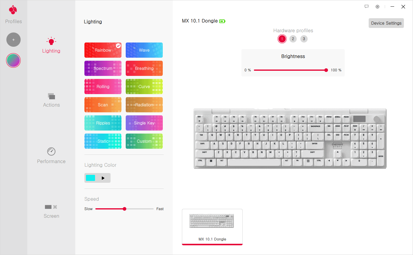 - CHERRY XTRFY MX 10.1 Wireless에 탑재된 로우 적축은 저소음 적축과 무접점의 특징을 섞은 느낌이었습니다. 저소음 적축처럼 정숙하지만 더 가볍고 빠른 편안한 키압(작동력 42cN)이었으며, 무접점처럼 손가락 끝에서 보글보글 거리는 기분 좋은 타건감을 경험할 수 있었습니다.