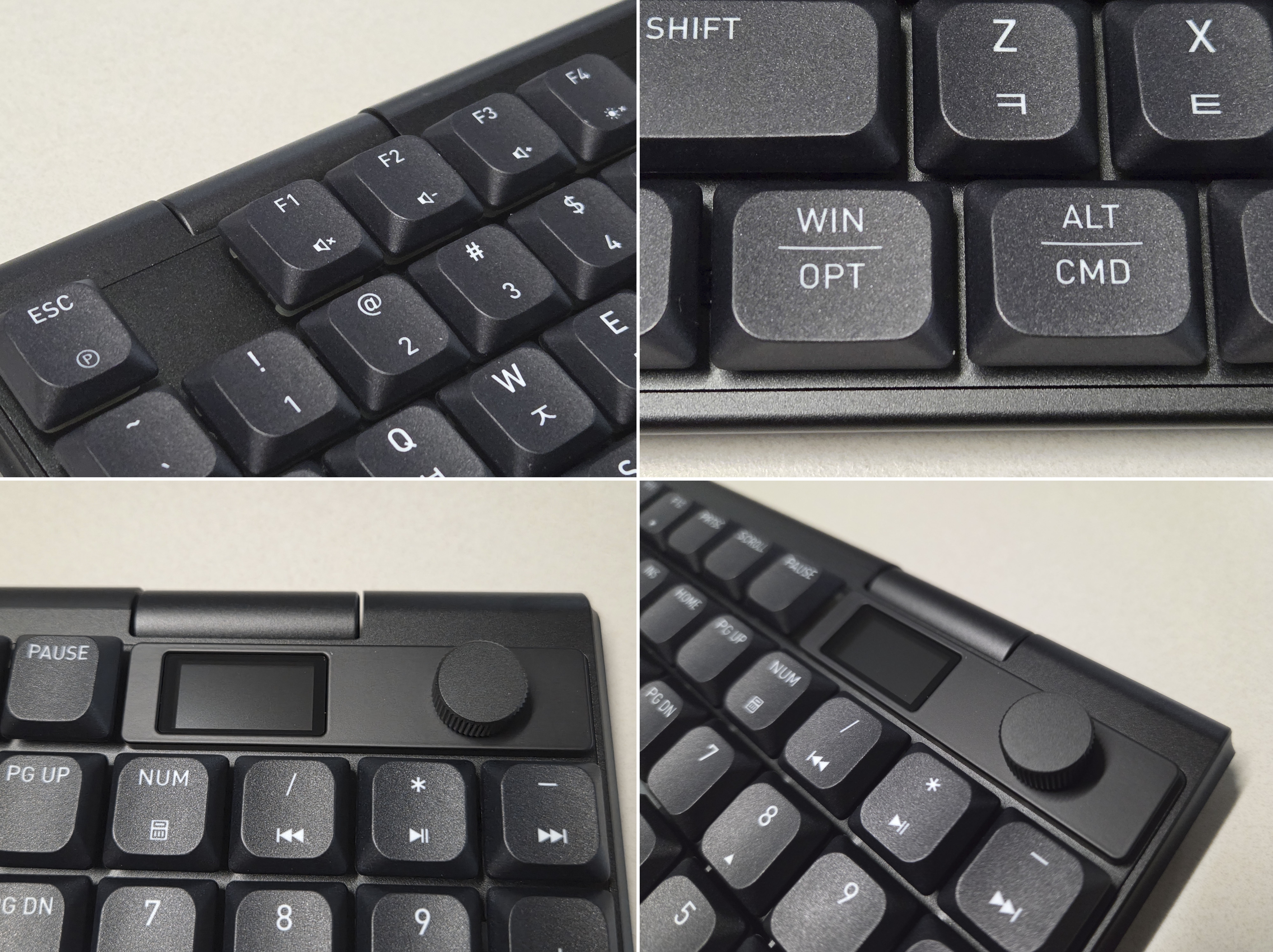 키보드 측면 상단에 있는 스위치로 Windows와 Mac 전환이 가능하며, LCD 디스플레이와 회전식 노브를 활용하여 연결 장치 전환, RGB 조명, 미디어 컨트롤 등 실사용시 편의 기능을 제공합니다. 메탈 재질의 멀티미디어 노브는 동일한 블랙 컬러라서 사진으로 구별이 잘 안되는지만, 실제로 노브를 만져보면 묵직하며 더욱 고급스럽습니다.