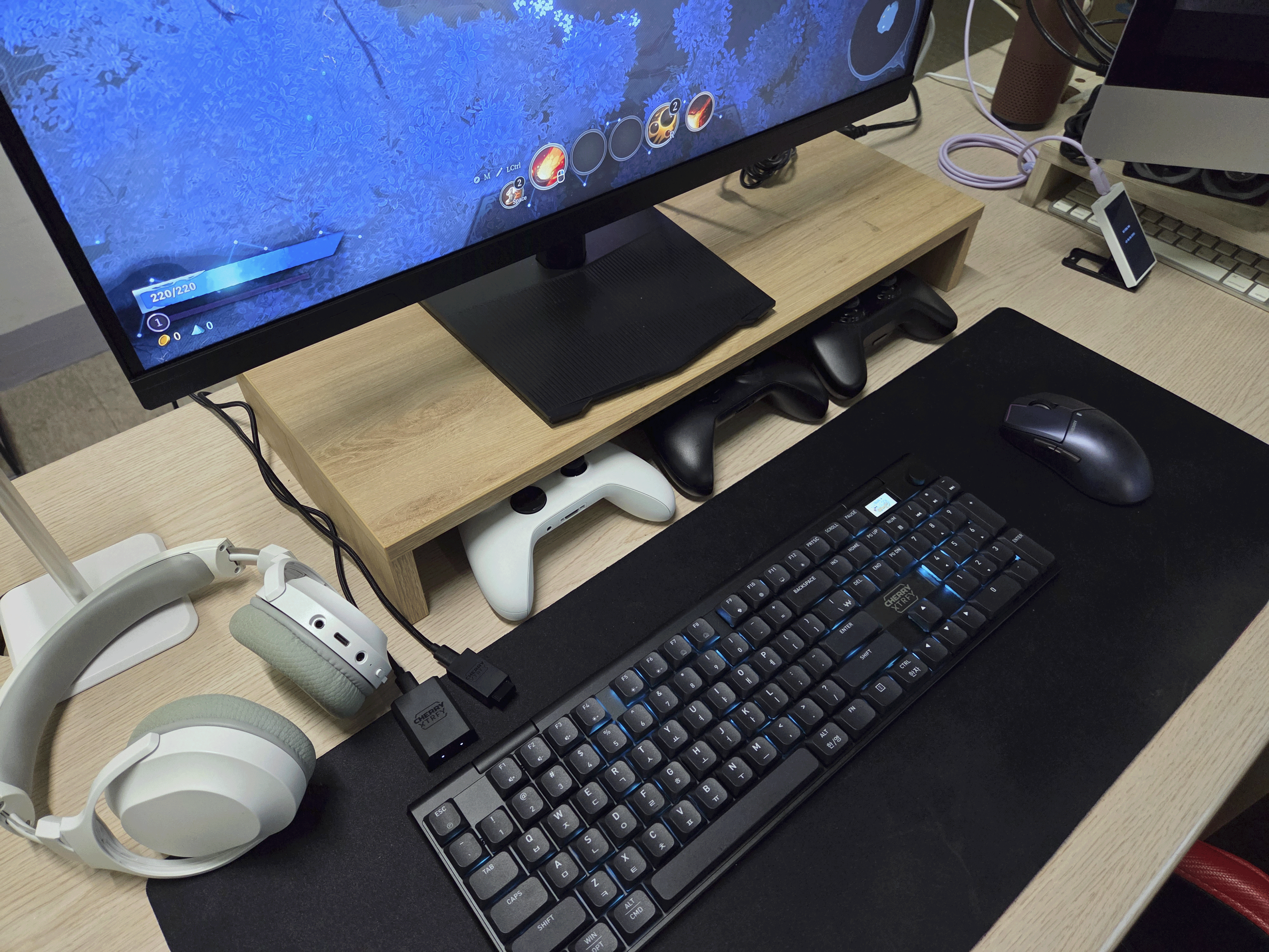 간만에 지저분했던 데스크를 정리하고, CHERRY MX 10.1 키보드와 CHERRY MW5500 마우스를 놓고, 최근 즐기기 시작한 게임 Shape of Dreams 플레이 화면과 함께 촬영해보았습니다.