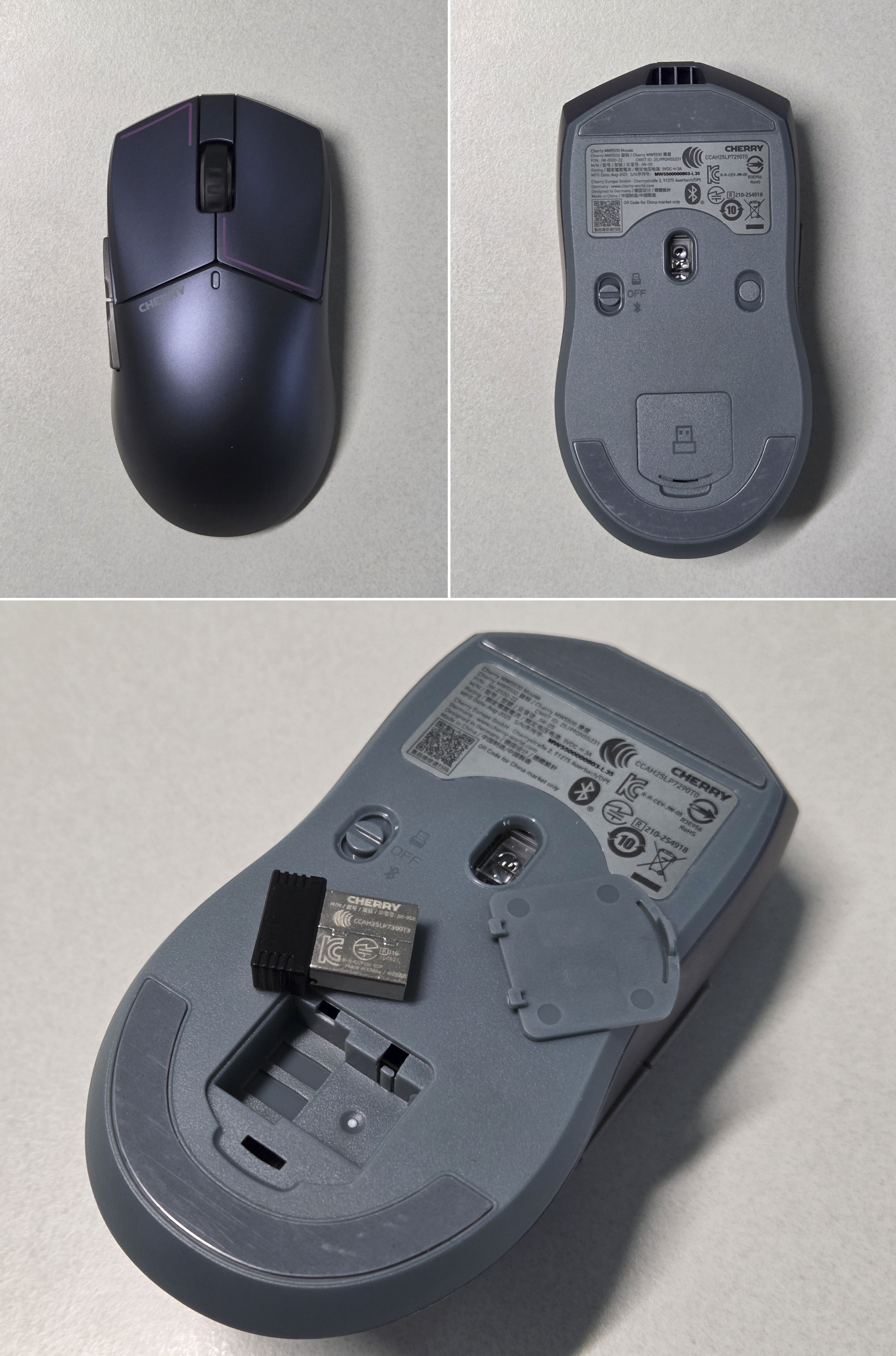 CHERRY MW5500는 USB 케이블을 통한 유선 연결, 2.4GHz 무선 동글, 블루투스 등 3가지 연결 모드를 지원합니다.