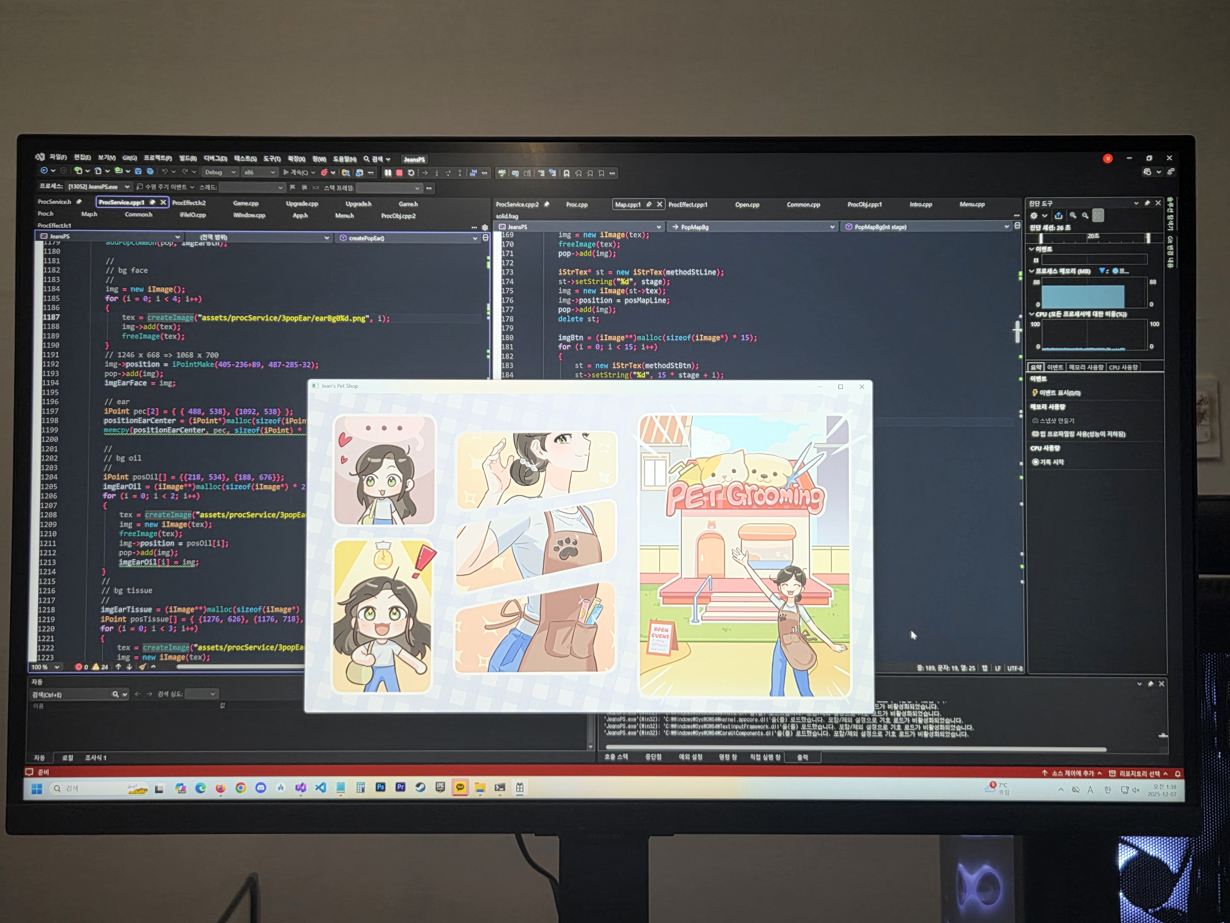 비주얼 스튜디오에서 윈도우 게임 개발 중인 작업 환경 사진입니다. 프로그래밍 코드 창 2개를 열어둬도 가로가 넉넉하며, 탭 3개를 열 경우 조금 좁다고 느껴질 만큼 코드 작성에 쾌적합니다.