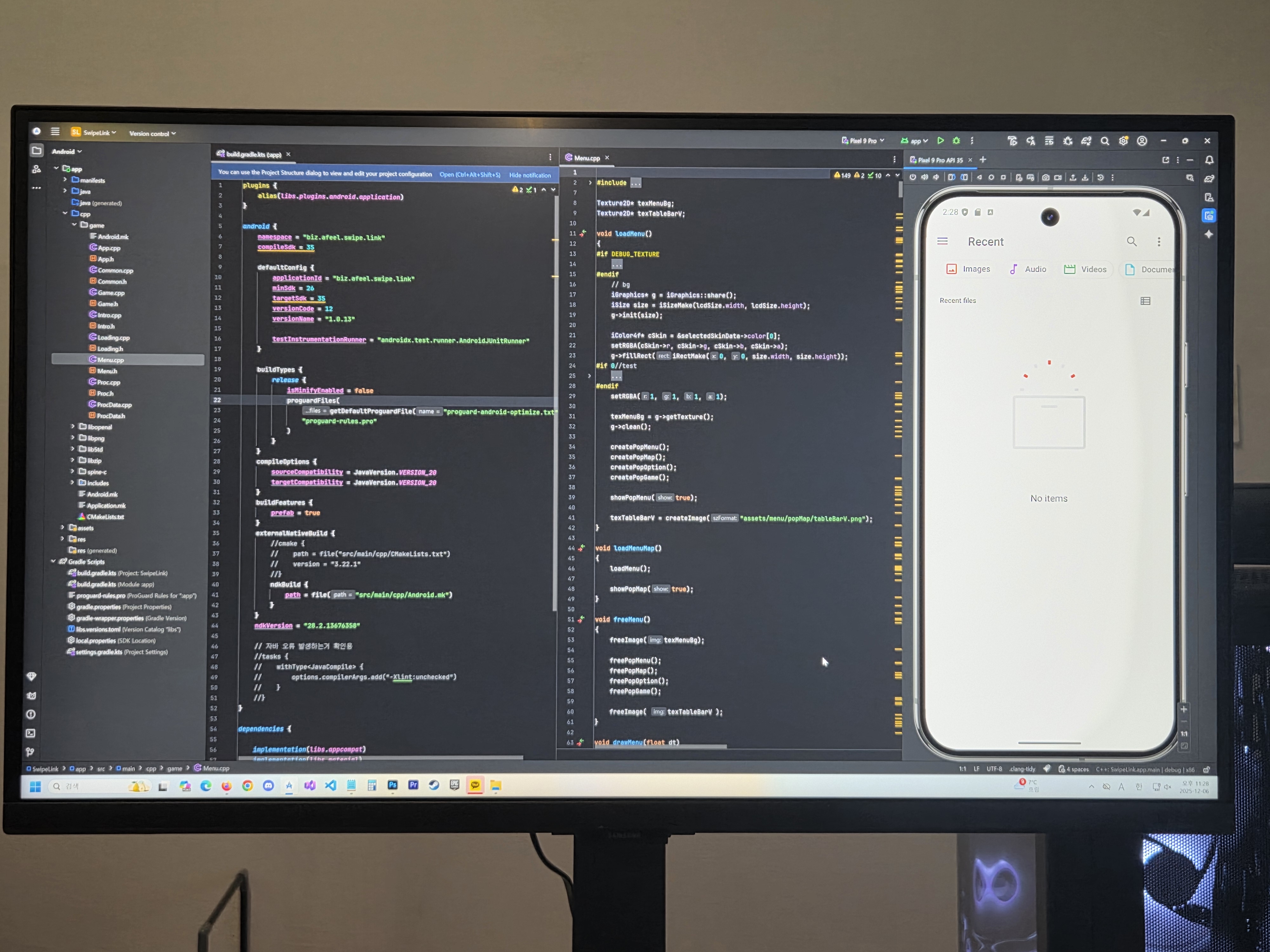 작업환경(유니티, 언리얼, 안드로이드 스튜디오 등에서 개발)에는 프로그래밍 코드 작성 공간 외에 네비게이터, 에뮬레이터들 때문에 화면이 좁게 느껴집니다. 멀티 모니터가 하나의 해결책이 될수도 있겠지만, 4K 모드 전환하면 아래 촬영한 사진처럼 화면을 더욱 효율적으로 활용할 수 있게 됩니다.
