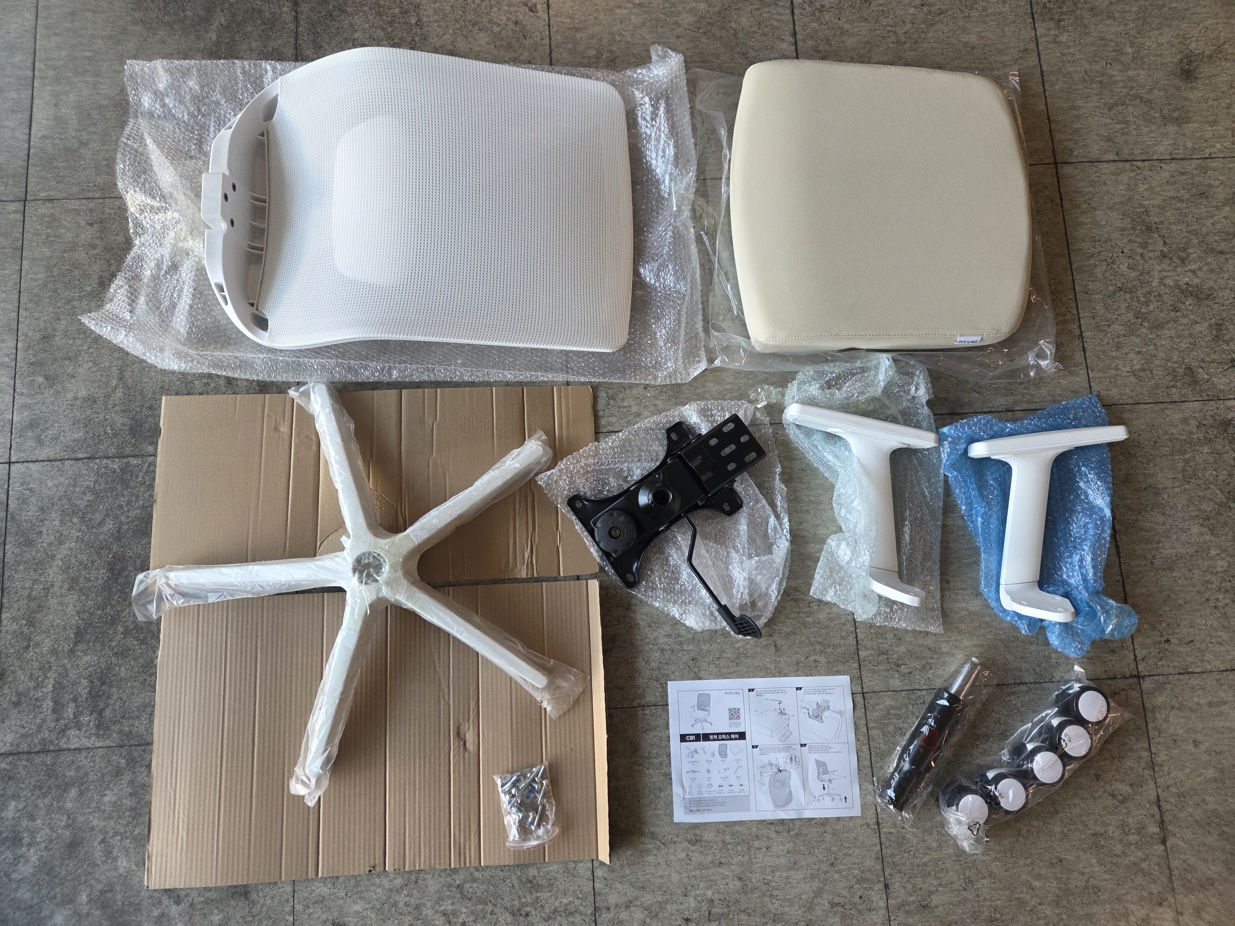 패키지는 등받이, 시트쿠션, 팔걸이, 높이조절 레벌, 받침대, 바퀴, 중심 기둥, 나사, 와셔, 육모렌치등으로 구성되어 있습니다. 직관적이고 간결한 제품설명서의 안내에 따라 조립하시면, 조립에 서툴거나 한번도 하지 않은 분들도 쉽게 조립할 수 있습니다.