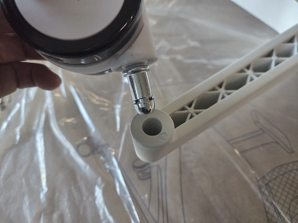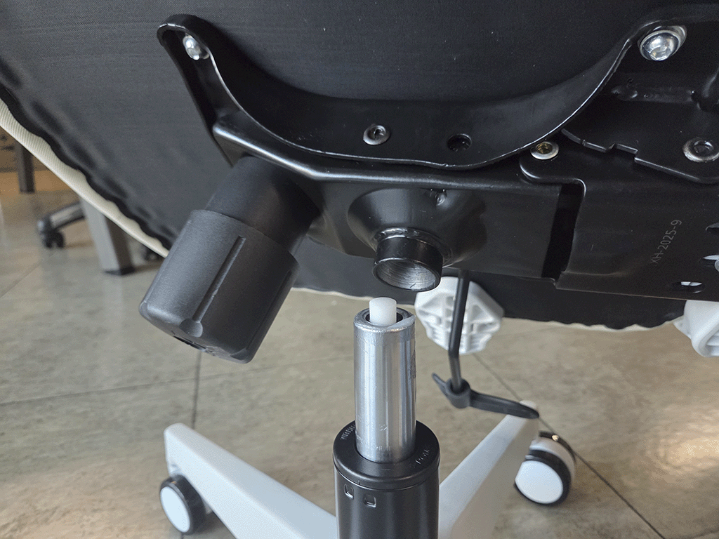 팔걸이와 등받이를 장착한 시트를 중심 기둥에 맞게 내려놓으면 드디어 조립이 완료됩니다.