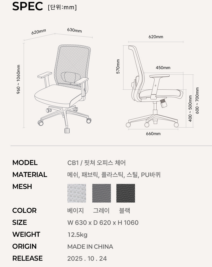 핏쳐 데스크체어 CB1는 보증기간은 구입일로부터 3년간 (주)카멜인터내셔널에서 받을 수 있으며, 베이지, 그레이, 블랙 등 3가지 모델이 있는데, 베이지 색상 제품을 기준으로 소개하겠습니다.