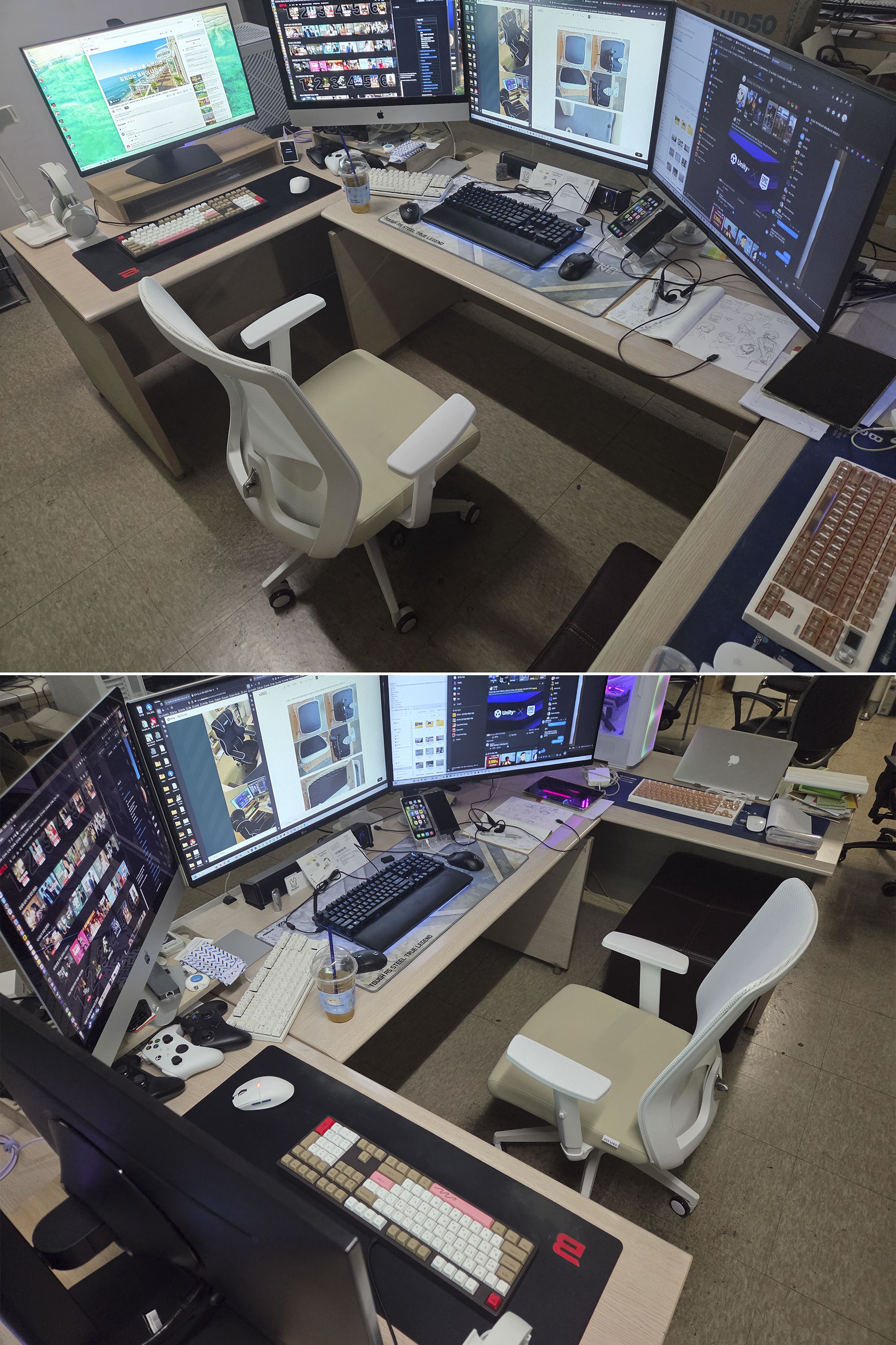 총 4대의 컴퓨터(아이맥, 맥북프로, 윈도우11, 리눅스)에 각각 키보드와 마우스 셋트로 있다보니 책상이 많이 복잡해 보이실겁니다. 사진 촬영전에 책상정리도 좀 할걸 막상 사진으로 공개하니까 부끄럽습니다. 실제 제가 작업하는 공간을 꾸밈없이 있는 그대로 촬영했다는 점만 염두해두고 봐주시길 바랍니다.