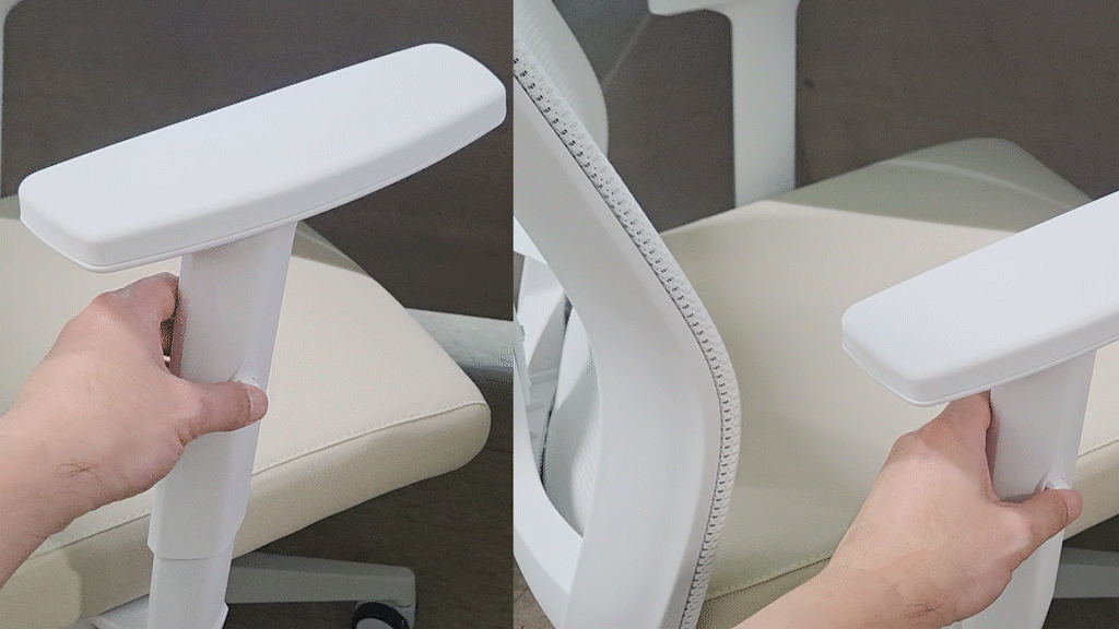 팔걸이는 4단계 높이 조절이 가능하고, 팔받침은 딱딱해 보이지만 표면은 말랑말랑한 촉감으로 오랫동안 팔을 기대고 있어도 편안합니다.